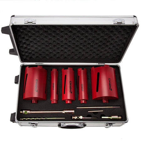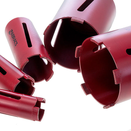 The Abracs 5 piece dry diamond core set is manufactured using tool grade steel and premium quality diamond grain.