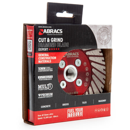 The Abracs 115mm Diamond Blade has been designed for cutting, grinding, flush cutting, edge grinding and shaping. These highly versatile Cut & Grind Blades are manufactured with a dual cutting edge and grinding face which enables multiple applications to be completed with just one blade. The M14 thread ensures quick, easy and safe fitting and removal.