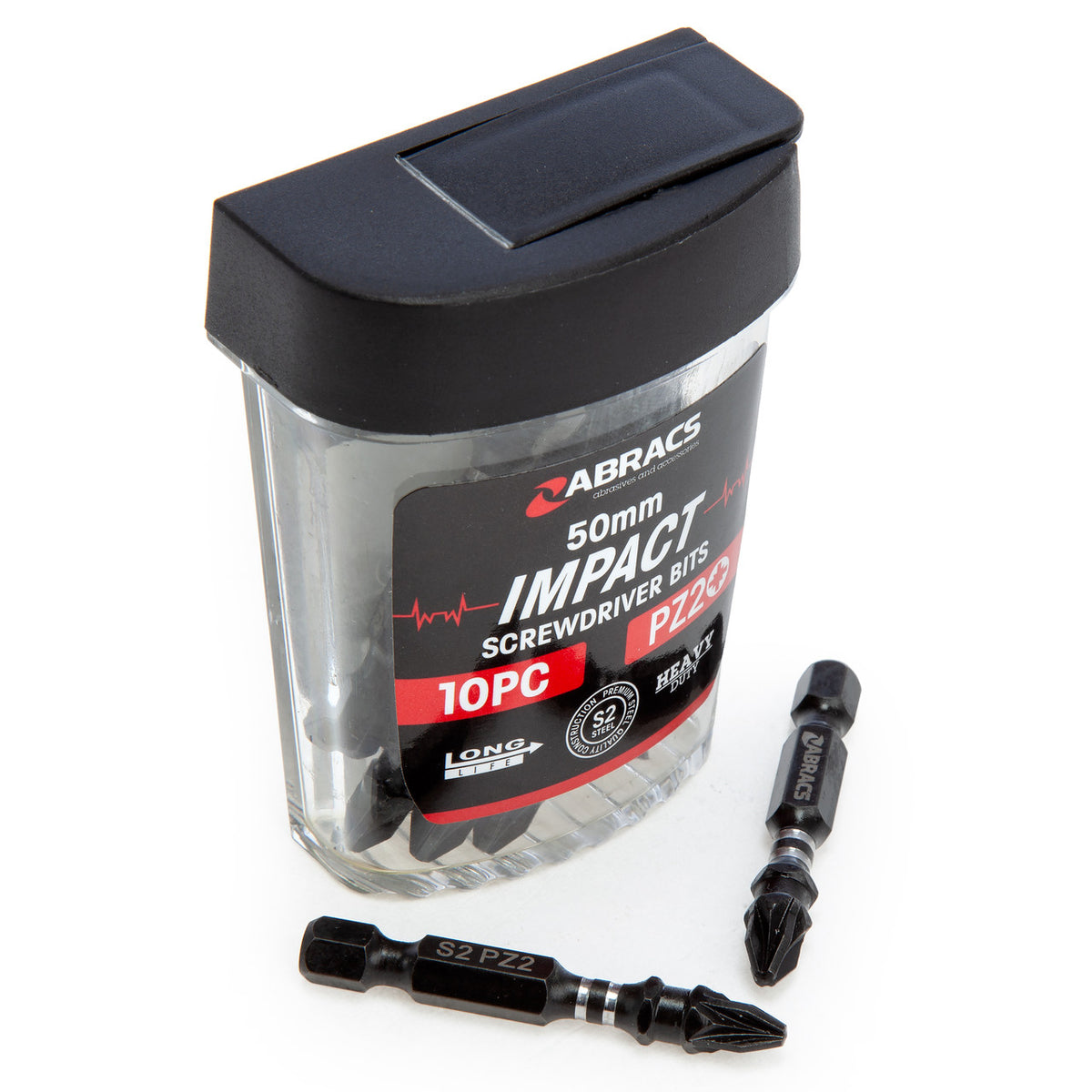 The Abracs IPZ25010 is a 10 Pack of 50mm long PZ2 Impact Screwdriver bits in a handy flip storage case. Abracs Impact Screwdriver Bits are manufactured with S2 Premium Steel for long life and are suitable for all heavy-duty screw driving applications. The addition of the torsion zone alleviates the stress and pressure put on the bit during drilling increasing endurance, product life and overall performance.