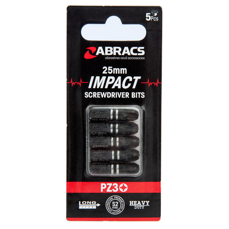 The Abracs IPZ32505 is a 5 Pack of 25mm long PZ3 Impact Screwdriver Bits. Abracs Impact Screwdriver Bits are manufactured with S2 Premium Steel for long life and are suitable for all heavy-duty screw driving applications. The addition of the torsion zone alleviates the stress and pressure put on the bit during drilling increasing endurance, product life and overall performance.