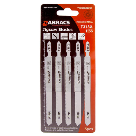 The Abracs ABT318A is a pack of 5 T318A Jigsaw Blades for Metal. They are of professional quality, perfect for cutting thin sheet metal and aluminium pipes. Their wavy set teeth are ideal for fine, straight cutting. They are so versatile and can be used with many brands of machine as listed below.