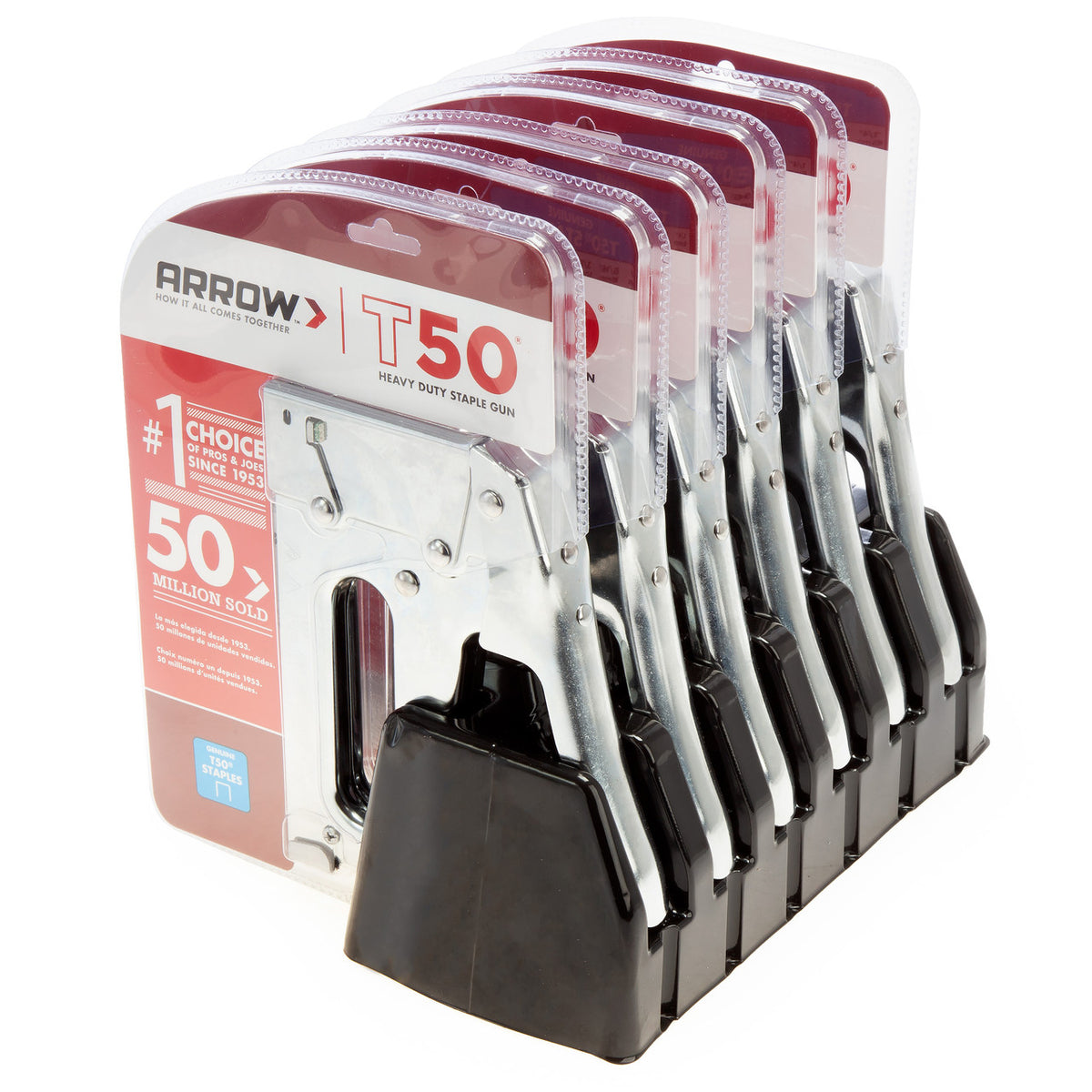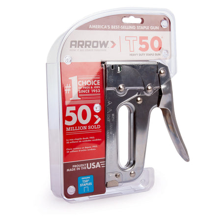 The Arrow T50 is America’s best-selling staple gun. Proudly made in the USA, it features an all chromed steel housing, jam-resistant mechanism, powerful coil spring, staple viewing window and steel working parts hardened in a 1,500-degree furnace. The number one choice of generations of professionals and homeowners alike, the Arrow T50 has become legendary for its uniquely American blend of functionality, dependability, and sheer ruggedness. General repairs, professional uses, upholstery, insulation, light trim. Satisfied customers say: "This is only the 2nd stapler I've owned in 35 years and both were Arrows. Love them and would recommend them to everyone." "Easy to use and works well! Did not have to read the instructions."