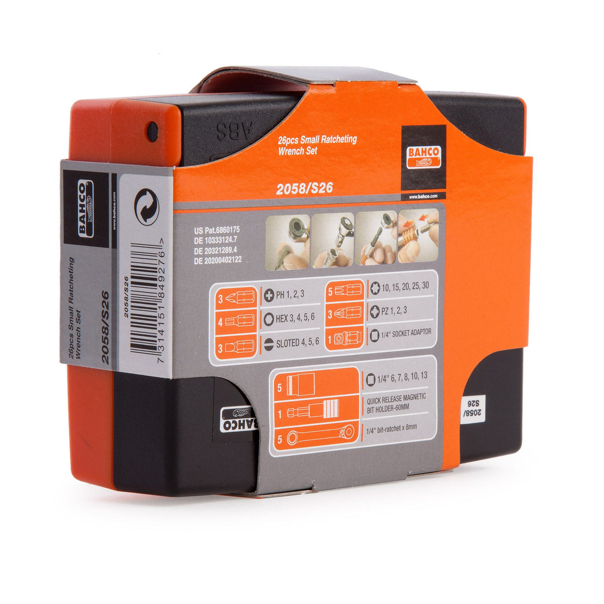 The Bahco 2058/S26 is a compact, pocket sized Socket Bit Set with 26 Pieces. Contains 18 different types of bits and 5 small sockets ranging from 6 - 13mm. Faster turning of fastener from the ring end ratcheting action. Quick release bit holder. High performance alloy steel, bits phosphated, sockets chrome finish. Supplied in plastic case measuring only 100 x 80 x 35mm