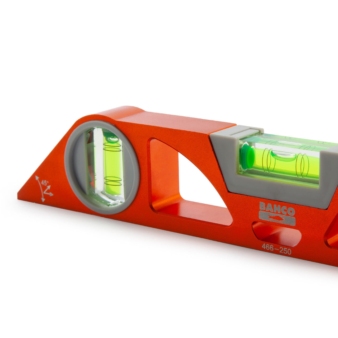 The Bahco 466-250 scaffold spirit level is robust and durable thanks to its solid anodized aluminium construction. It can withstand the impacts of the job site with high-precision ± 0.5 mm/m accuracy. The open frame design makes handling easier and 45° and 30° angles pre-sets allow for quick angle setting.