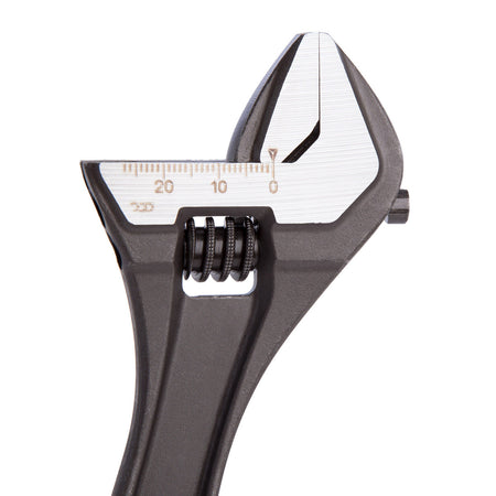 The Bahco 8071 Adjustable Spanner is able to withstand high torque loads in many trades. It has been specially heat-treated for the utmost strength, durability and corrosion resistance and features tapered jaws with a 15-degree head angle. The fixed jaw has a measurement scale to indicate the approximate size of nuts, bars and screws and its comfortable handle ensures a secure grip.
