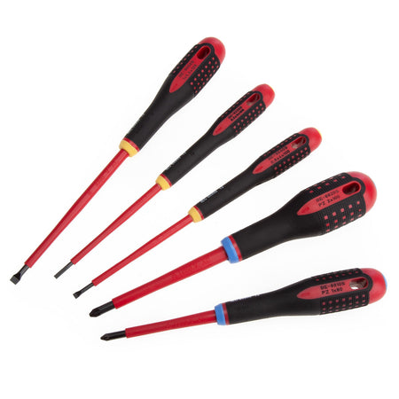 The Bahco BE-9882S is a 5 piece Slotted and Pozi insulated screwdriver set. These screwdrivers are extremely long-lasting and durable thanks to their high-performance alloy steel blade. They feature colour-coded handles making it easy to identify the correct tip for the intended application and are suitable for live working use up to 1000V a.c.