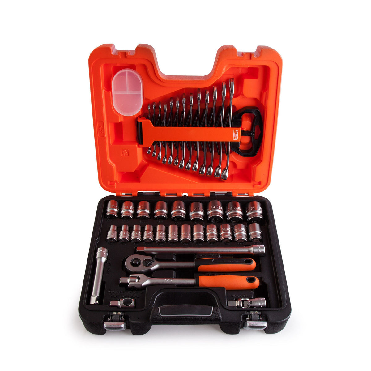 A comprehensive selection of matt chrome plated sockets, combination spanners and extension bars in a high quality case with spring loaded clasps.