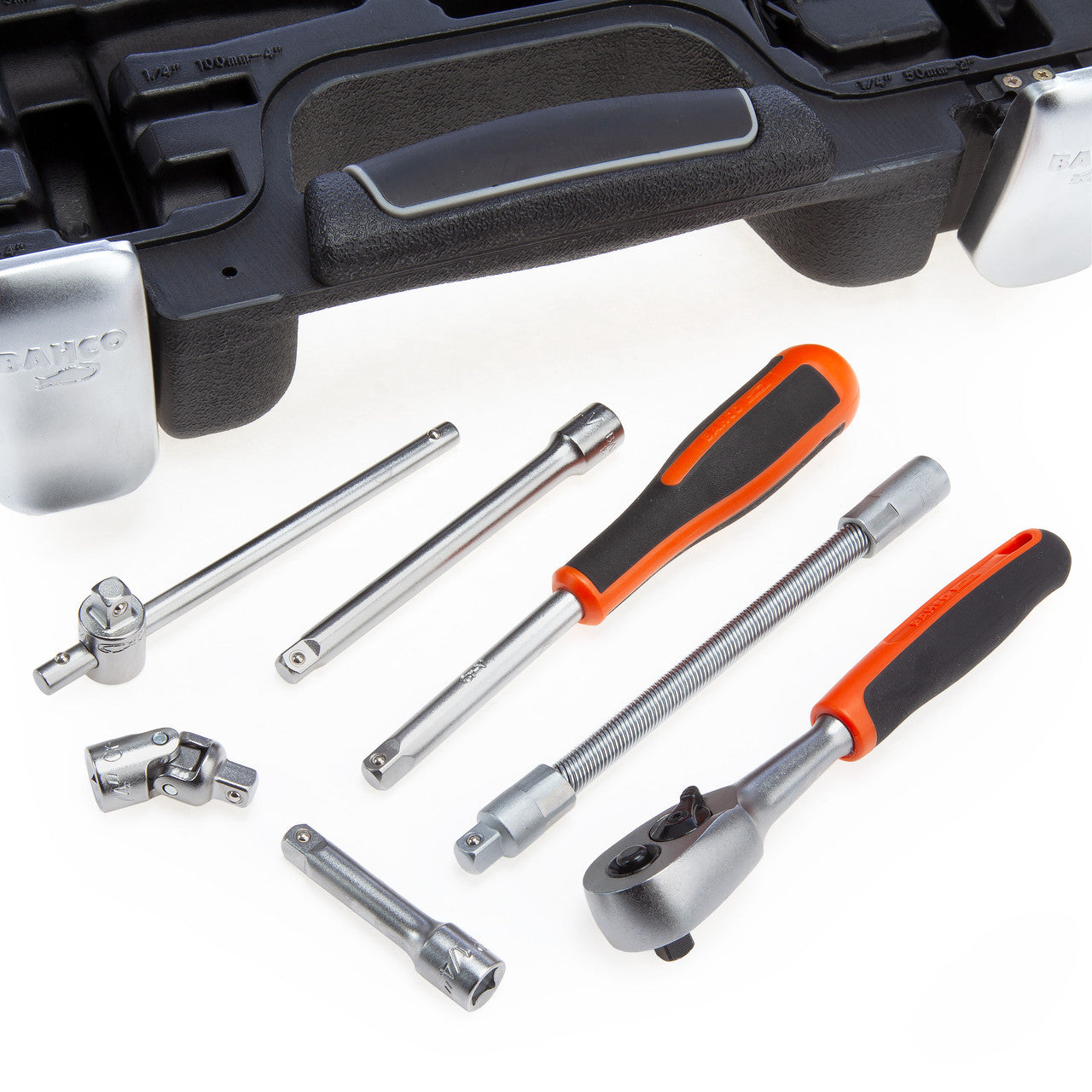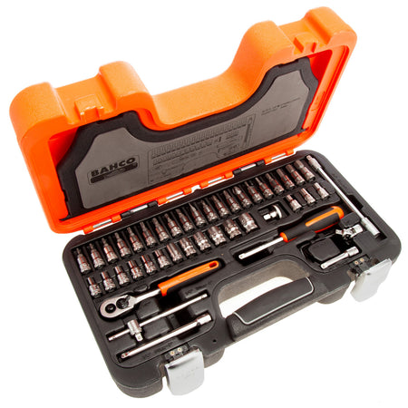 A great 46 piece socket set from Bahco comes in a plastic case that's made of oil and temperature resistant polypropene. The chrome vanadium pieces with matt finish are manufactured to DIN 3120 / ISO 1174 standard.