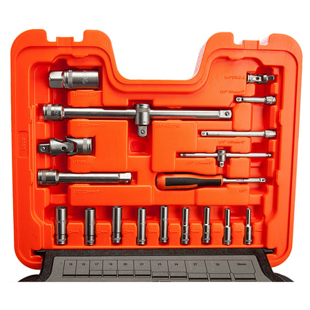 - 15 x 1/2" Hexagonal Sockets: 10, 12, 13, 14, 15, 16, 17, 18, 20, 21, 23, 24, 27, 32 and 34mm
