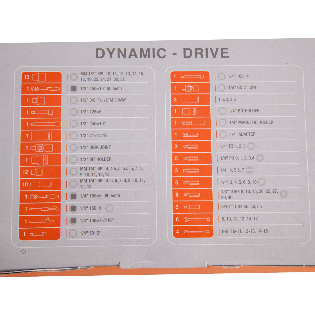 - 22 x 1/4" hexagonal Dynamic Drive sockets