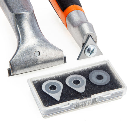 - Carbide blades for easy removal of paint, glue, varnish and rust off various surfaces