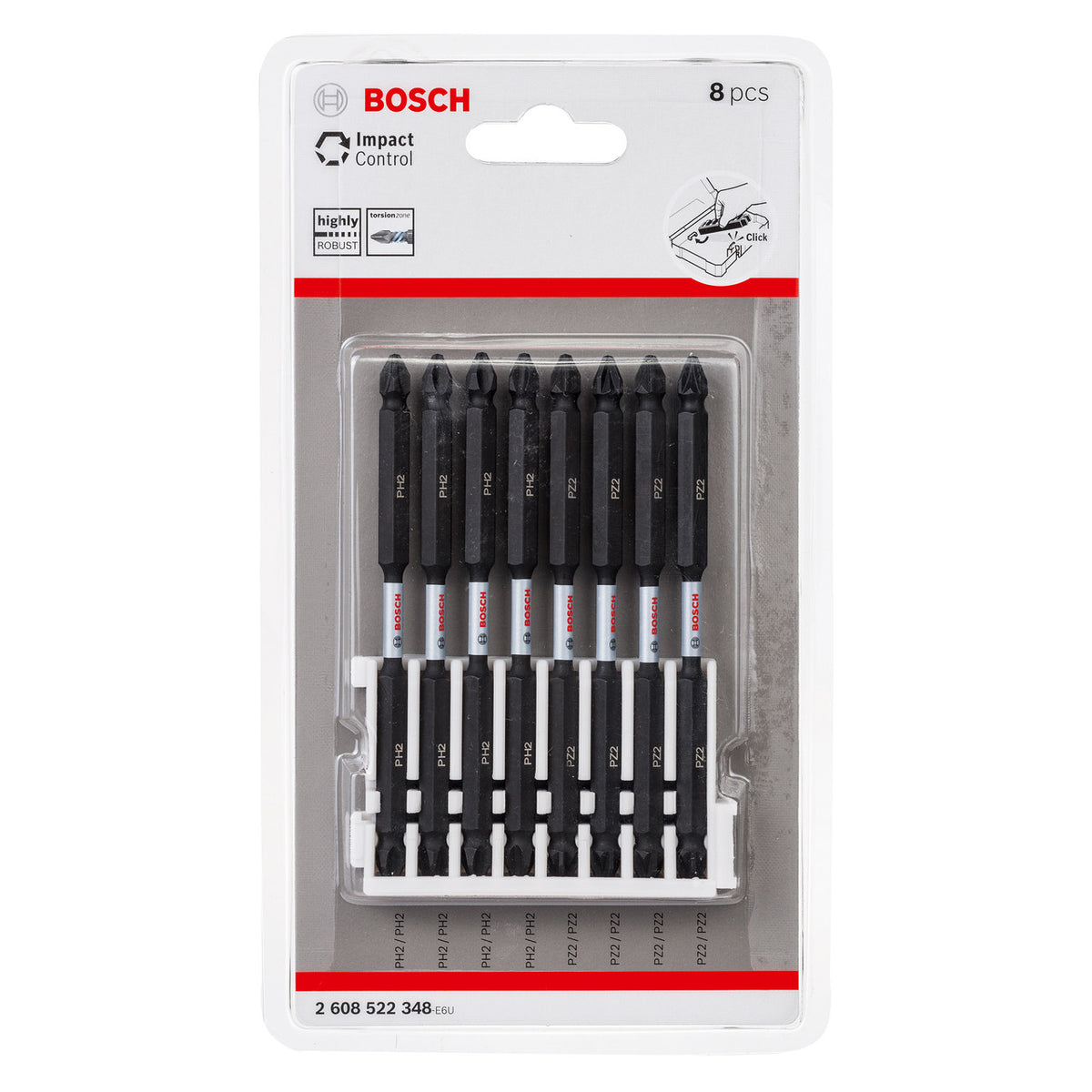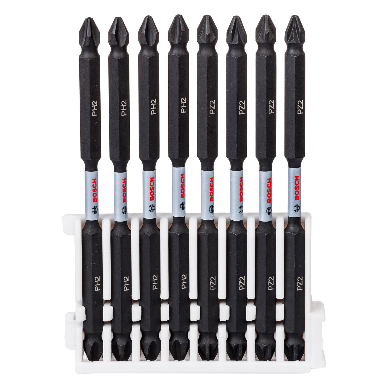 The Bosch 2608522348 Double Ended Screwdriver Bit set consists of 8 x 110mm Bits. 4 Bits are double ended PH2, the other 4 Bits are double ended PZ2. All are highly robust and ideal for heavy duty applications, even withstanding the high power of impact drivers. The bits feature an extended torsion zone that makes them extremely sturdy for long-lasting work. They have 1/4-inch external hex shanks for use with drill drivers, screwdrivers, and especially with impact drivers. S2 Modified Steel and an optimised heat-treatment process provide extra-tough endurance for high performance, including in plant installations or heavy industrial work. This Set is part of the Bosch Pick and Click system, which enables individually buildable accessory sets for fully customisable bit collections. Click-fitting slots perfectly secure individually purchased packs for a personalised collection and the easy replacement of old packs.