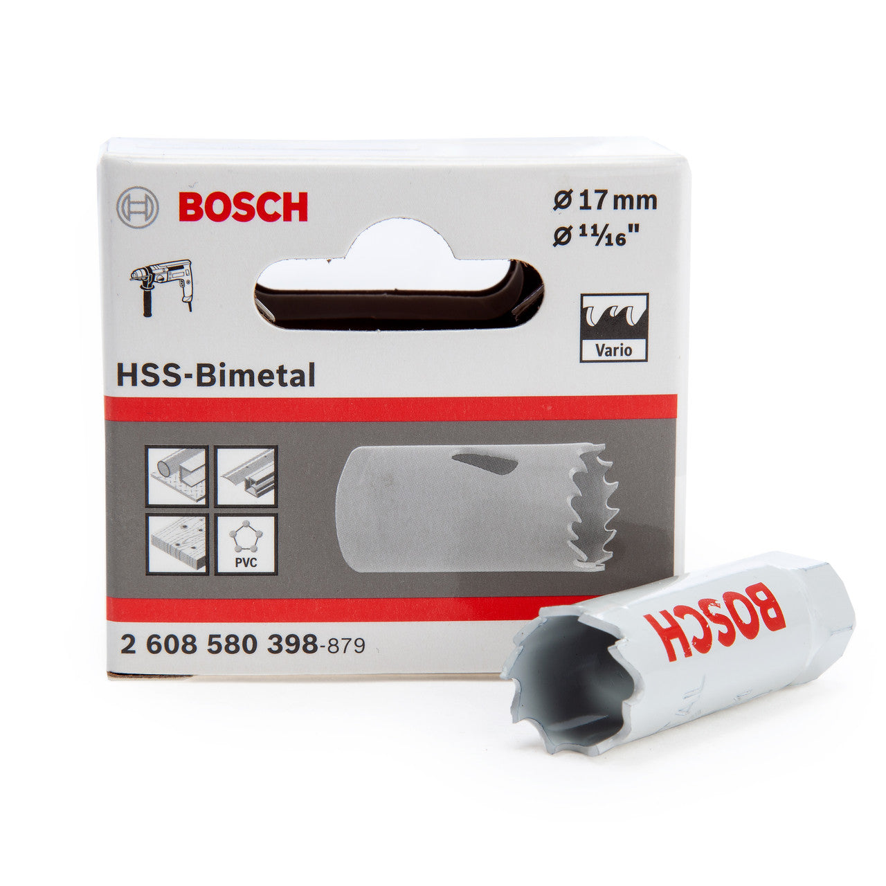 The Bosch 2608580398 has an 11/16in - 17mm diameter and a working depth of 38mm. It is designed to be used with Rotary Impact Drills or Rotary Hammer Drills. The bi-metal Hole Saw offers smooth cutting through various materials. The tooth configuration (Vario tooth strip) is ideal for gliding through material to provide smooth cuts. Made of bi-metal HSS (high-speed steel) containing 8% cobalt alloy, this hole saw has less risk of tooth breakage and higher heat resistance for long-lasting cutting. Use this hole saw when cutting through wood, metal and plastics The bi-metal Hole Saw fits all standard adapters on the market.