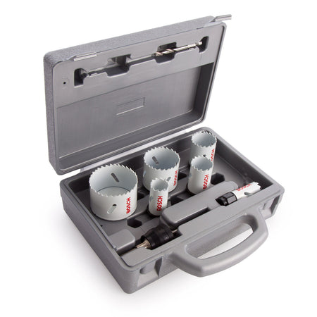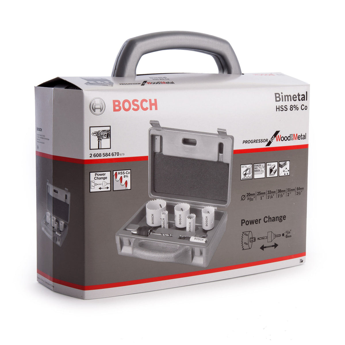 The Bosch 9 Piece HSS-Bimetal Progressor Holesaw Kit contains 6 holesaws in sizes from 20mm to 64mm or 25/32 inch to 2.1/2 inch. Suited to cutting both wood and metal they are made with 8% Cobalt Alloy.