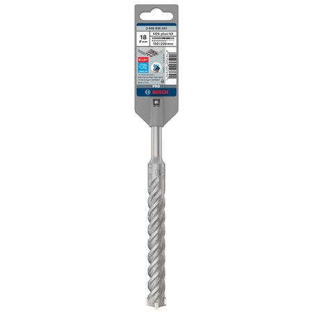 The Bosch 2608836631 is a single SDS Plus-5X drill bit with a diameter of 18mm and a working depth of 150mm. SDS Plus bits offer highly efficient drilling in reinforced concrete and masonry. They have a 4-flute design which provides fast dust removal so the bit can slice through concrete and rebar quickly with reduced wear. The centring tip prevents wandering and geometrical form prevents jamming.