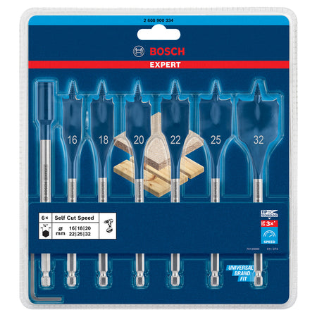 The Bosch 2608900334 is a Flat Drill Bit Set with 6 drills in diameters 16, 18, 20, 22, 25 and 32mm and an extension. All pieces are 152mm in length with a 1/4 inch shank. Spade bits are a great accessory for electricians and other installation and building workers. What if they could be even faster and more efficient? With Bosch Tip Technology, they can. Equally at home in softwoods, chipboard or particleboard, the Bosch EXPERT SelfCut Speed Spade Bit offers efficiency and convenience to tradesmen who need to drill through holes or blind holes for cabling, dowels and other hardware installations. suited to rotary drills, rotary impact drills and impact screwdrivers.