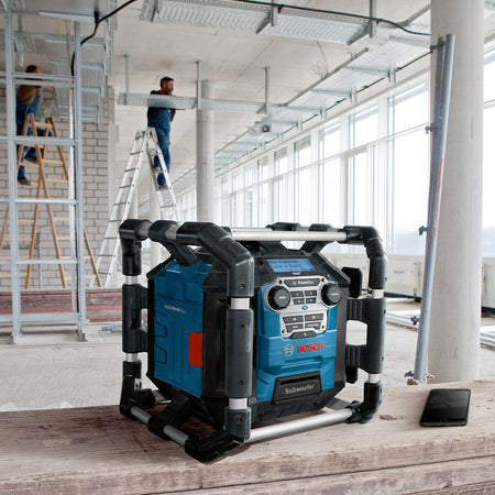 The GPB 18V-5 SC Professional Radio is a robust music maker for powerful sound and is compatible with DAB+, Bluetooth, FM, and AUX. This sturdy radio always provides the right sound to make work enjoyable. The perfect choice to set the musical tone in rough working environments, the GPB 18V-5 SC Professional comes with a protective roll cage. Crystal clear and massive at the same time, this radio’s impressive sound is provided by four speakers with a combined output of 20W and an integrated subwoofer (20W) for powerful bass response. This unit is particularly suitable for digital radio reception and playing music via smartphones. It is compatible with all Bosch Professional 18 V batteries. Powered via 18V or main AC power and additionally offers two outlets for powering tools and USB for fast charging with up to 2.1A. Sold without a battery or charger.