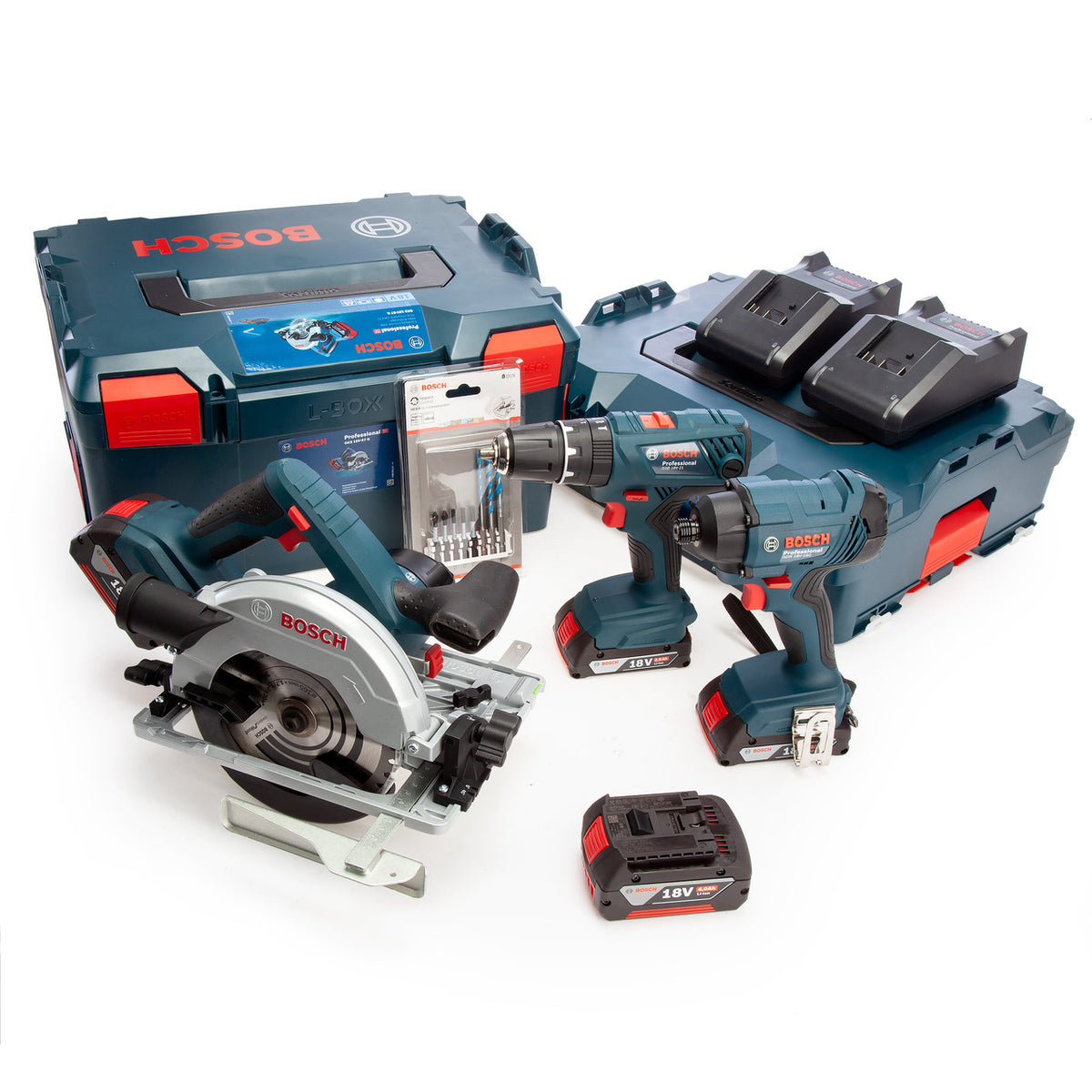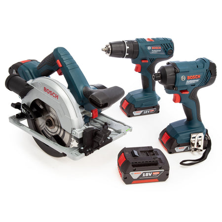 This Bosch 3 Piece Kit consists of the GDR 18V-160 Impact Wrench with 1/4 inch internal hexagon drive, GSB 18V-21 Combi Drill with the 13mm keyless chuck and the GKS 18V-57 G Circular Saw capable of cuts up to 57mm deep. The kit also includes 2 x 4.0Ah + 2 x 2.0Ah Batteries, 2 x Chargers, 2 x L-BOXX Cases and an 8 Piece MultiConstruction Drill & Impact Screwdriver Bit Set.