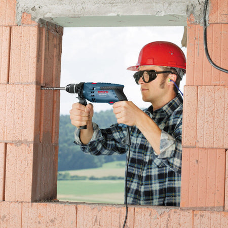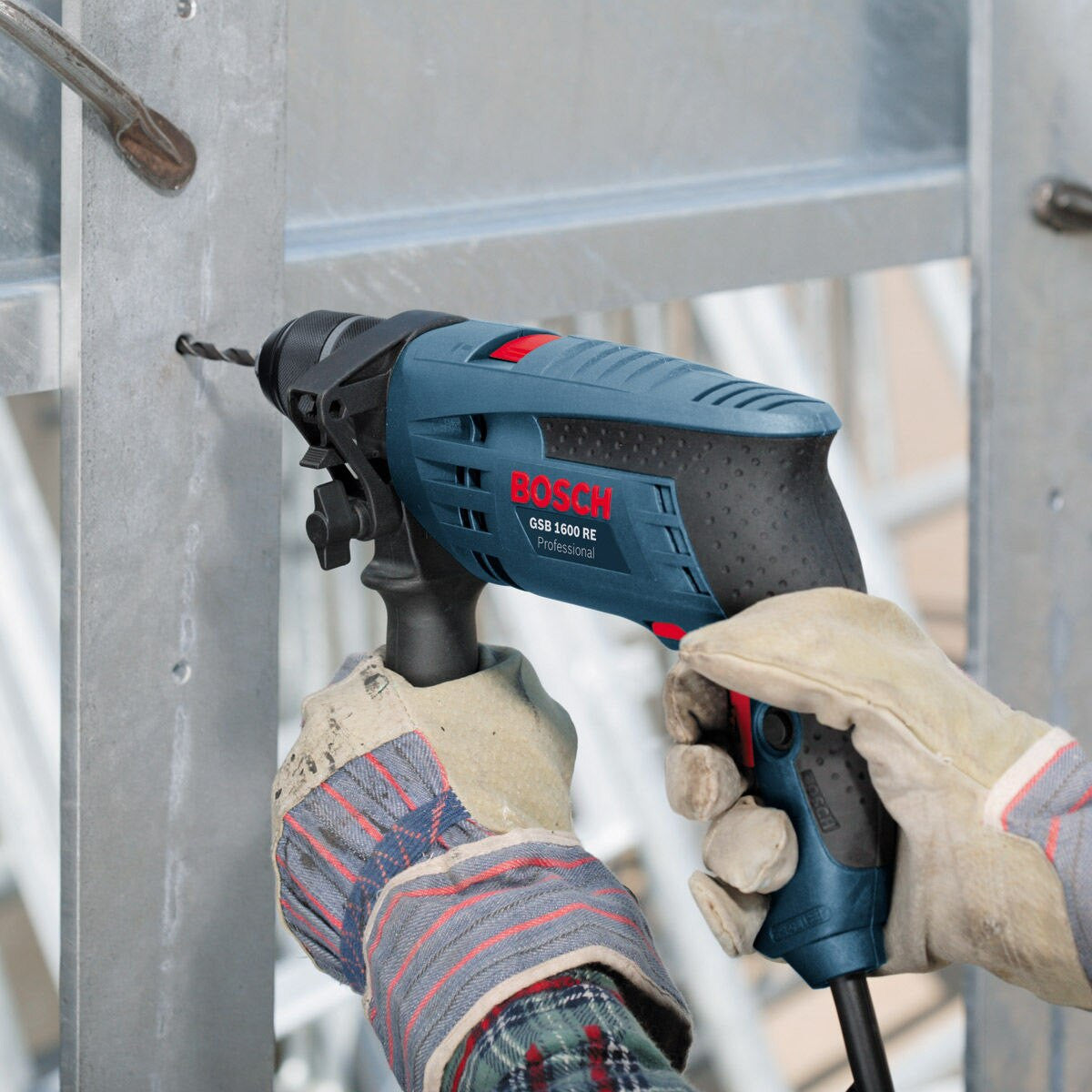 The Bosch GSB 1600 RE is a powerful corded impact drill with 701W motor. It has a metal quick change chuck for increased durability and easy accessory change and a soft grip for comfortability under prolonged use. This model is compact and lightweight yet suited to the most demanding applications. It features variable speed control which makes the tool perform to the best-suited speed for the material.