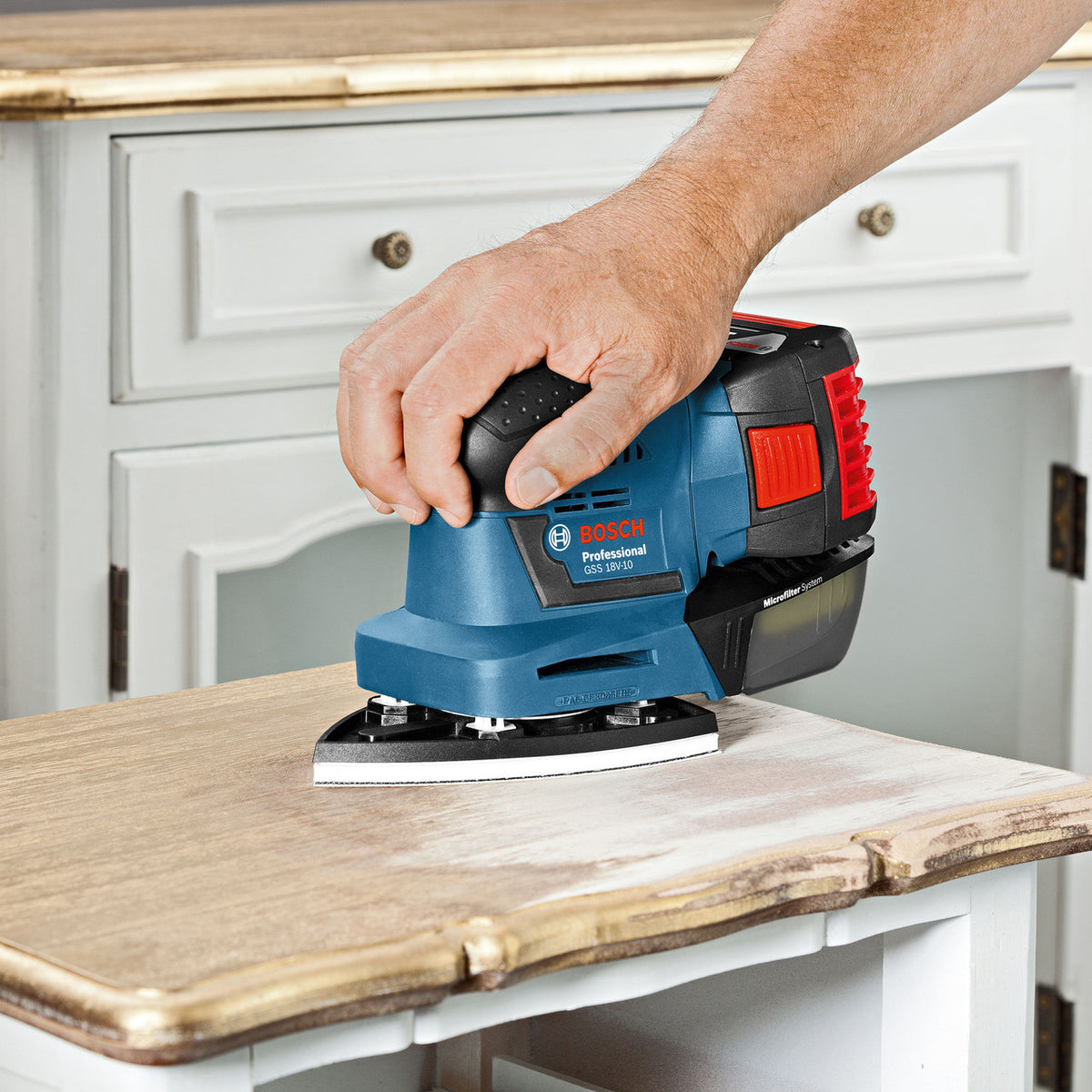 The Bosch GSS 18V 10 Professional Multi-base orbital sander features Real flexibility: Three sanders in one! This cordless, compact tool, has a long life and running time and with a flexible base pad, its lightweight and compact design make it ideal for use overhead or in difficult to reach places. It is smaller than the comparable corded sander yet has all the benefits of one. This product comes as a body only without batteries or a charger.
