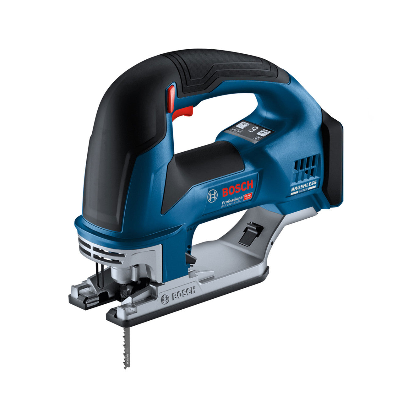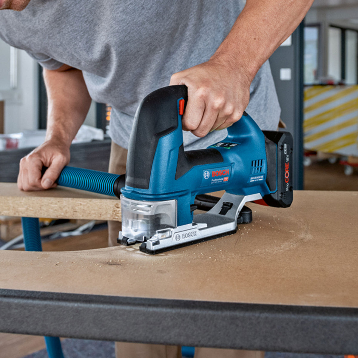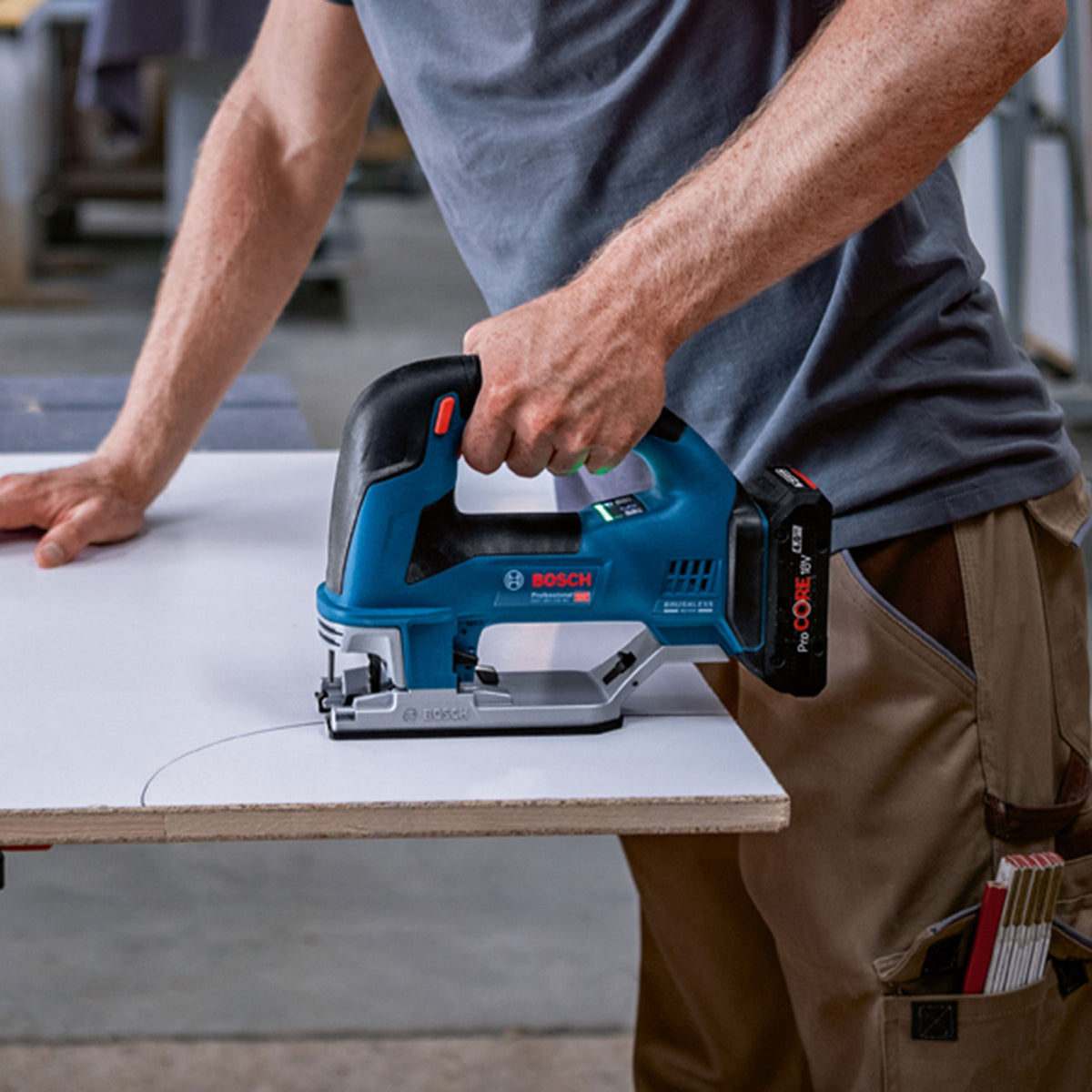 This Bosch cordless jigsaw is ideal for curved and cross cuts in solid wood, chipboard, and wood composites as well as in thicker or harder materials. It has a powerful brushless motor, capable of cutting up to 155mm in wood, and features variable speed control for more controlled cuts in precise applications.