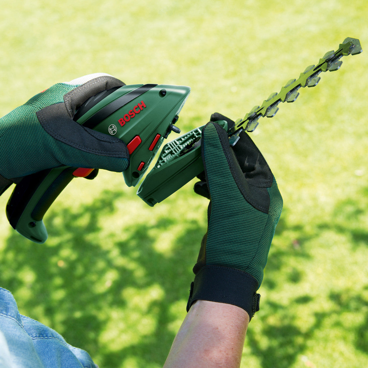 With the Bosch ISIO you can switch between the edging shear and shrub shear in the blink of an eye with no need for any tools