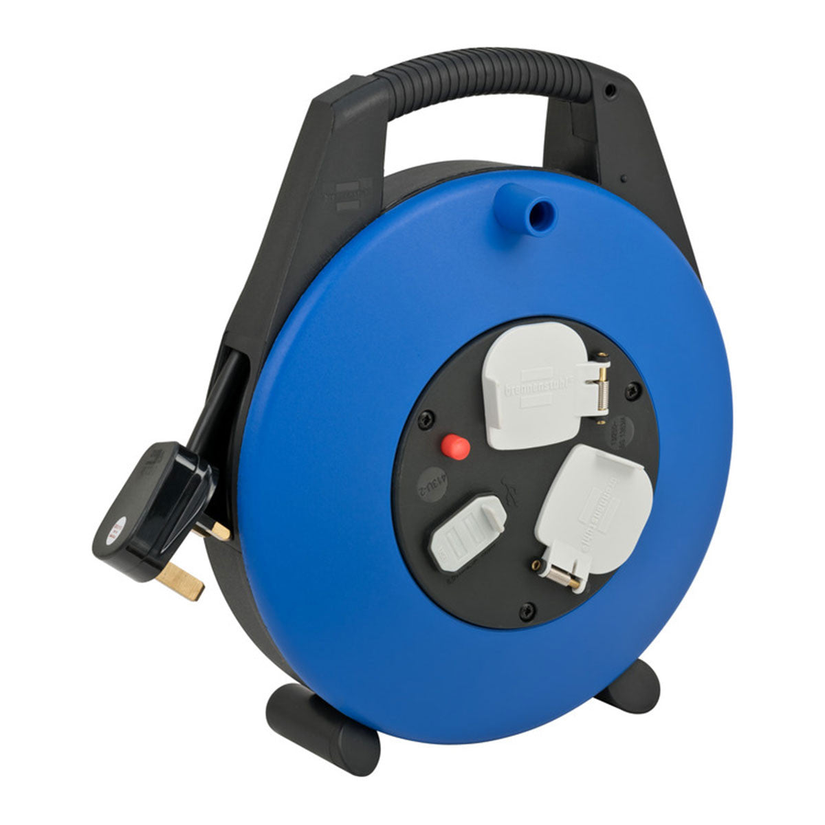 - Handy and stable mini cable reel with 2 protective contact sockets with self-closing lids and overheating protection