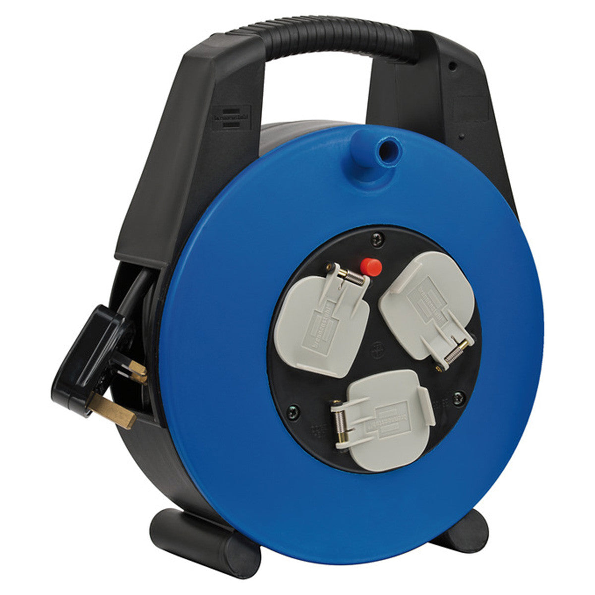 - Enclosed cable reel with casing made of break-proof plastic on twin feet for high stability