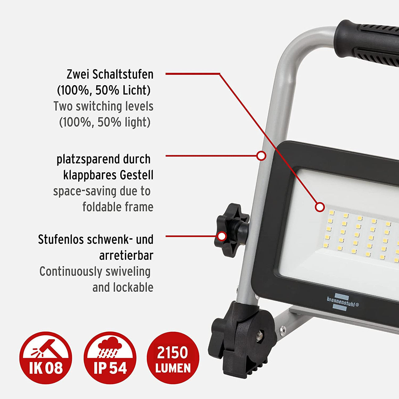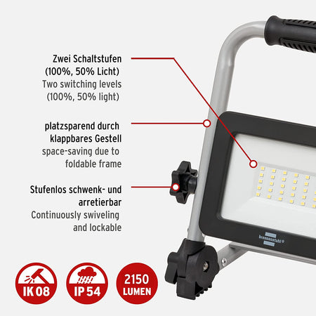 - Portable Floodlight with 2150 lm has two switching levels (100%, 50% light) - perfect to adjust the work light according to the requirements and needs
