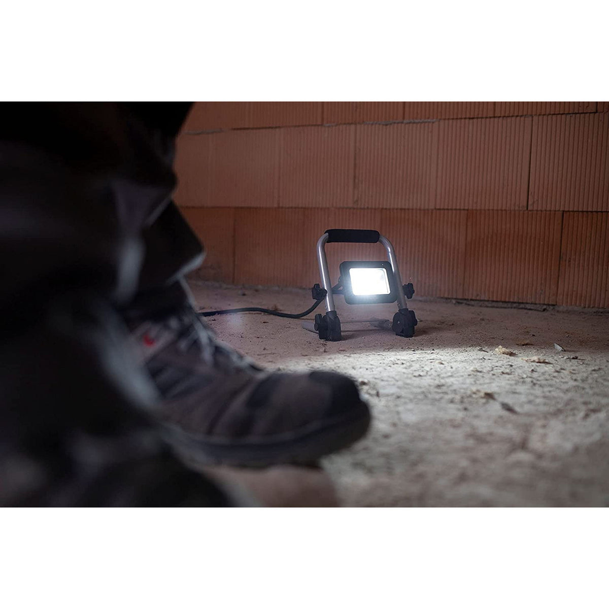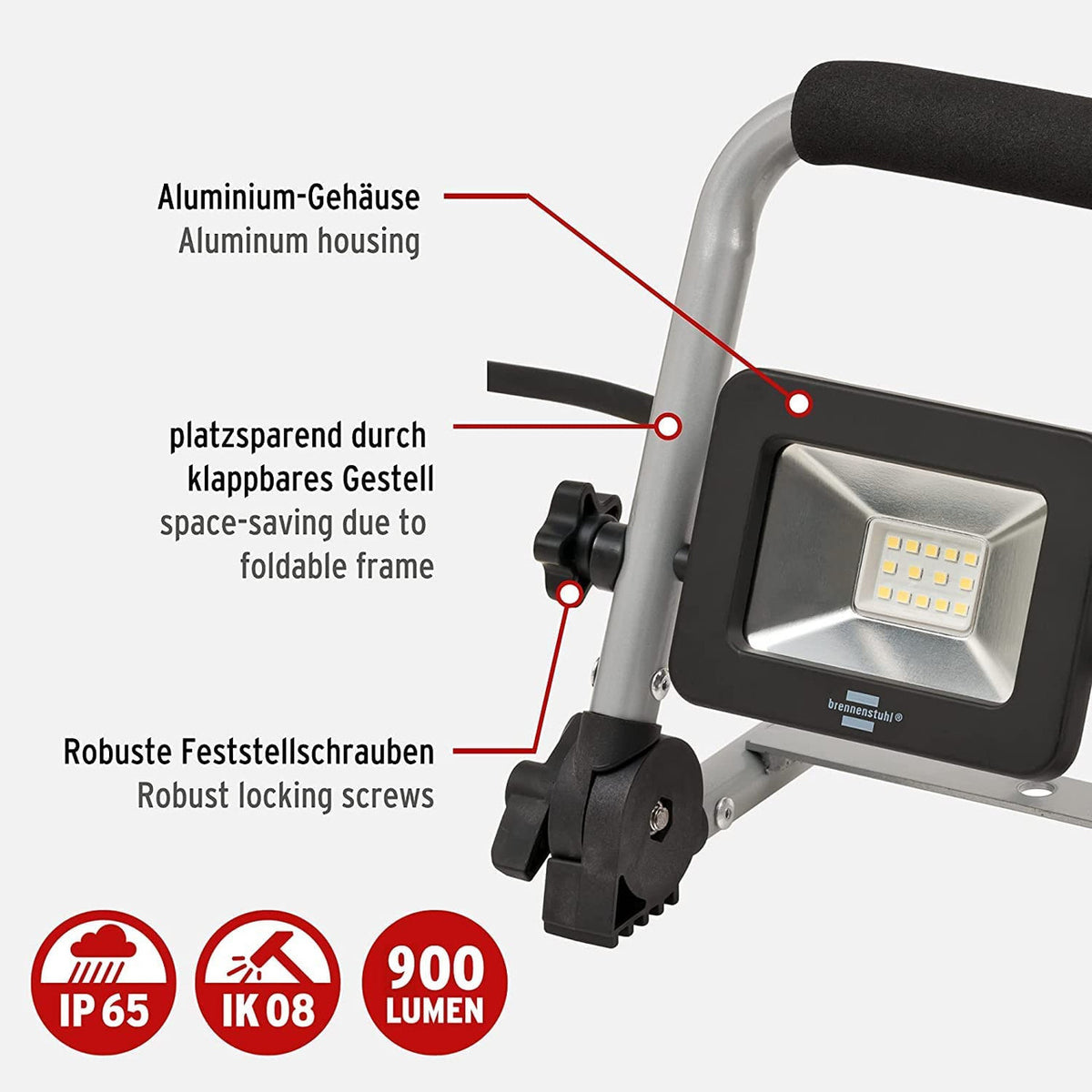 - Portable floodlight 900 lm with aluminium housing, robust locking screws for fixing the floodlight and sturdy tubular steel frame