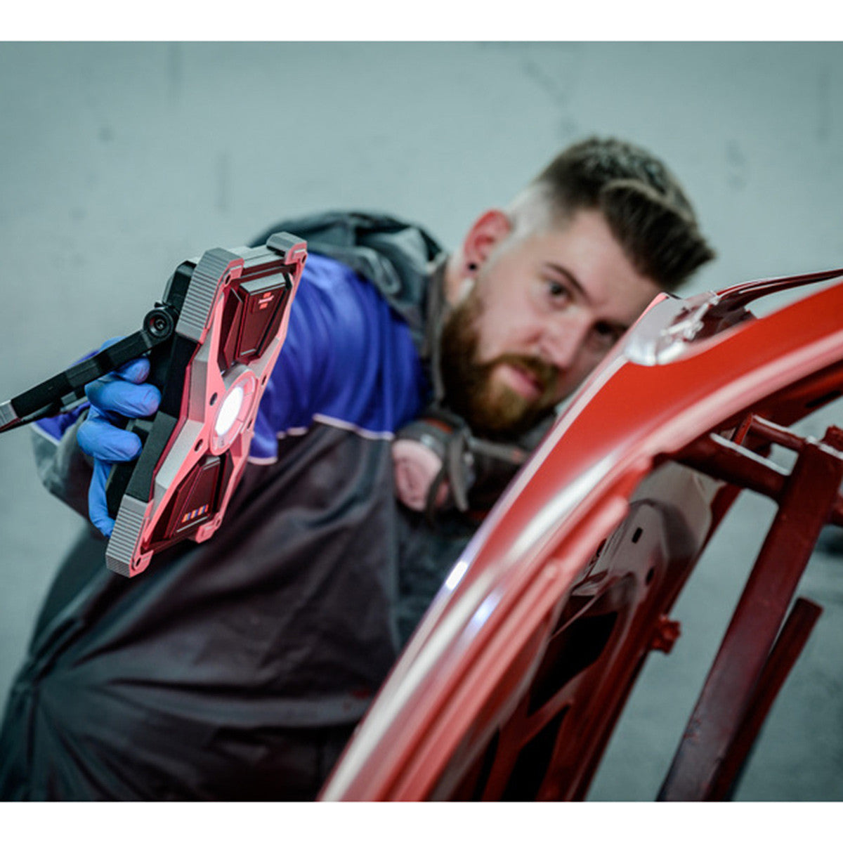 The 3020 MAis an extremely bright and robust RUFUS LED worklight with IP65 protection (dust and jet-proof) and a very high CRI value is ideal for painting work in workshops, construction sites or in the automotive sector. The high colour rendering index of 15CRI 96 and the ability to switch between several colour temperatures enable accurate assessment of colour quality on various surfaces, for example when matching colours or detecting paint defects. With a housing made of solid die-cast aluminium and additional edge protection made of high-quality plastic, it is suitable for both indoor and outdoor use. The floodlight has a built-in rechargeable battery with a charging time of 5 hours and a memory function that saves all settings. The construction spotlight is charged via the charging interface and with the help of the type A/C charging cable supplied. The LED spotlight can continue to shine during the charging process.