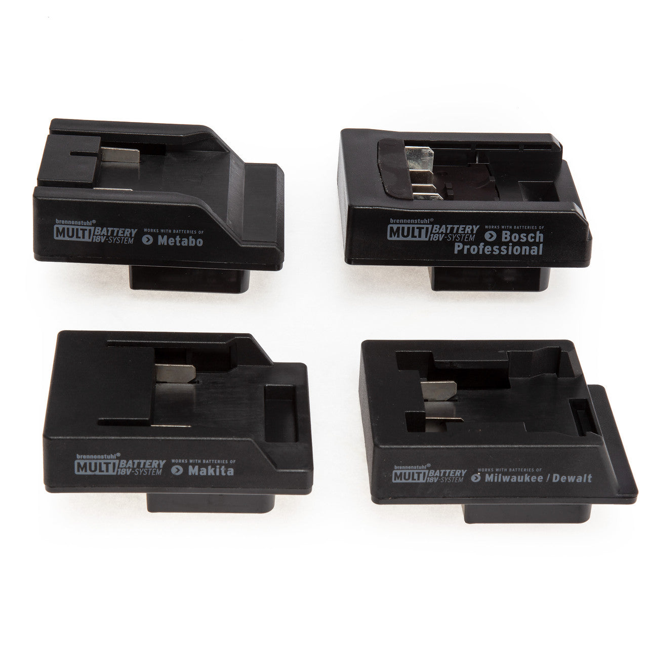 Thanks to the Brennenstuhl Multi Battery 18V System, the extremely robust and bright Multi Battery LED Work Light with 40 W power is compatible with different 18V batteries (different Ah classes) from the 7 power tool manufacturers Bosch Professional, Dewalt, Makita, Metabo CAS and Milwaukee. So no matter which battery system is already in use, the interface technology allows maximum flexibility and it is possible to fall back on the battery system of your choice. With just a flick of the wrist, the appropriate adapter (4 included) can be inserted at the interface. The portable floodlight with enormous luminosity thanks to built-in COB LEDs also has a battery status display for the remaining energy of the batteries used (the batteries are to be charged externally) and a protection system for Powertool batteries. This protects the batteries from deep discharge and overheating (caused by high load currents).