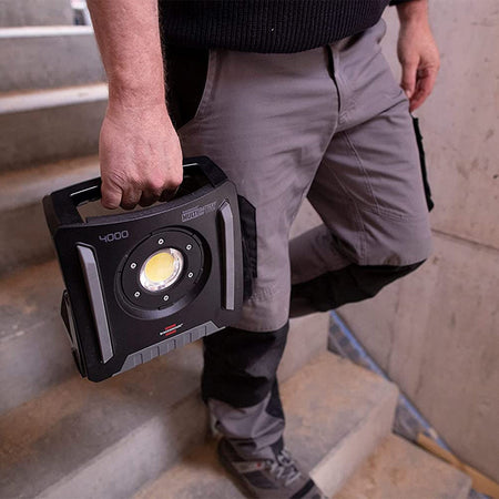 - Construction site light with 4 switching levels (100% - 75% - 50% - 25%) and protection system for Powertool batteries: protected against deep discharge, overheating (caused by high load currents) and battery faults