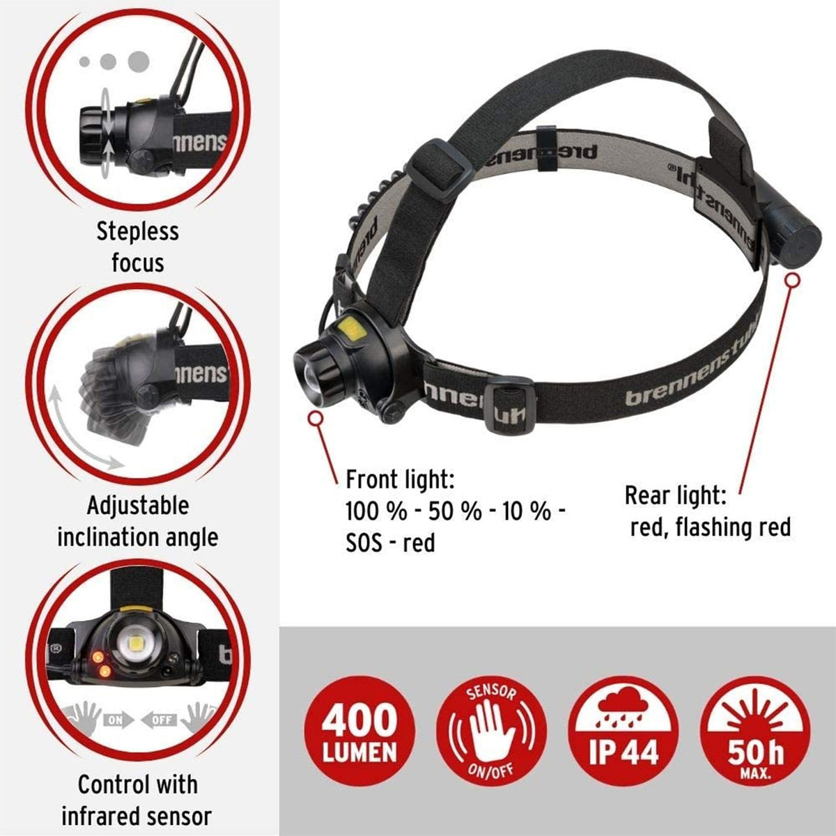 - Scope of delivery: 1x LuxPremium LED Head Torch SL 400 AF with sensor (400lm, incl. Li-Ion battery 3,7V/2,6 Ah), 1x USB cable - in best quality from Brennenstuhl