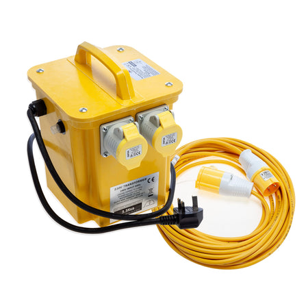 A 110V Transformer with 340V input and a 14 Metre long 110V Extension Lead in Yellow