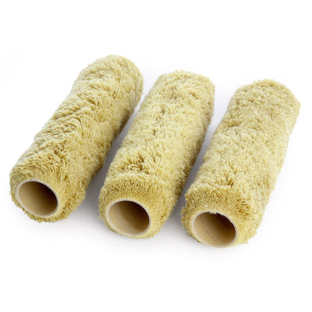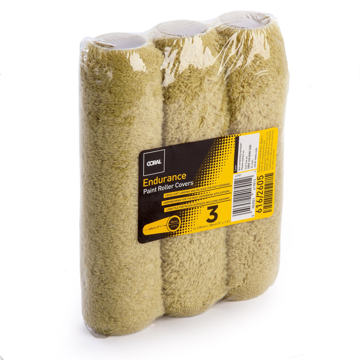 The Coral 41701 Endurance Set consists of 3 hardwearing Polyacrylic Rollers with a long pile paint roller cover for a superior finish on textured and rough surfaces The Coral Endurance 9" Roller Cover 1.5" LP 3 Piece Set is an impressive choice with a hardwearing design. If you want to be assured of superior, labour-saving coverage on textured surfaces and reduced lint loss, a durable, long pile woven fabric will deliver a long, twisted fabric securely attached to the backing. 3 x 9 Inch (229mm) paint roller sleeve compatible with roller frames using a 1.5" (38mm) diameter head. Produced with a polyacrylic fabric thermofused to a plastic core. Don't be without this 9" paint roller cover triple pack on your next painting project.