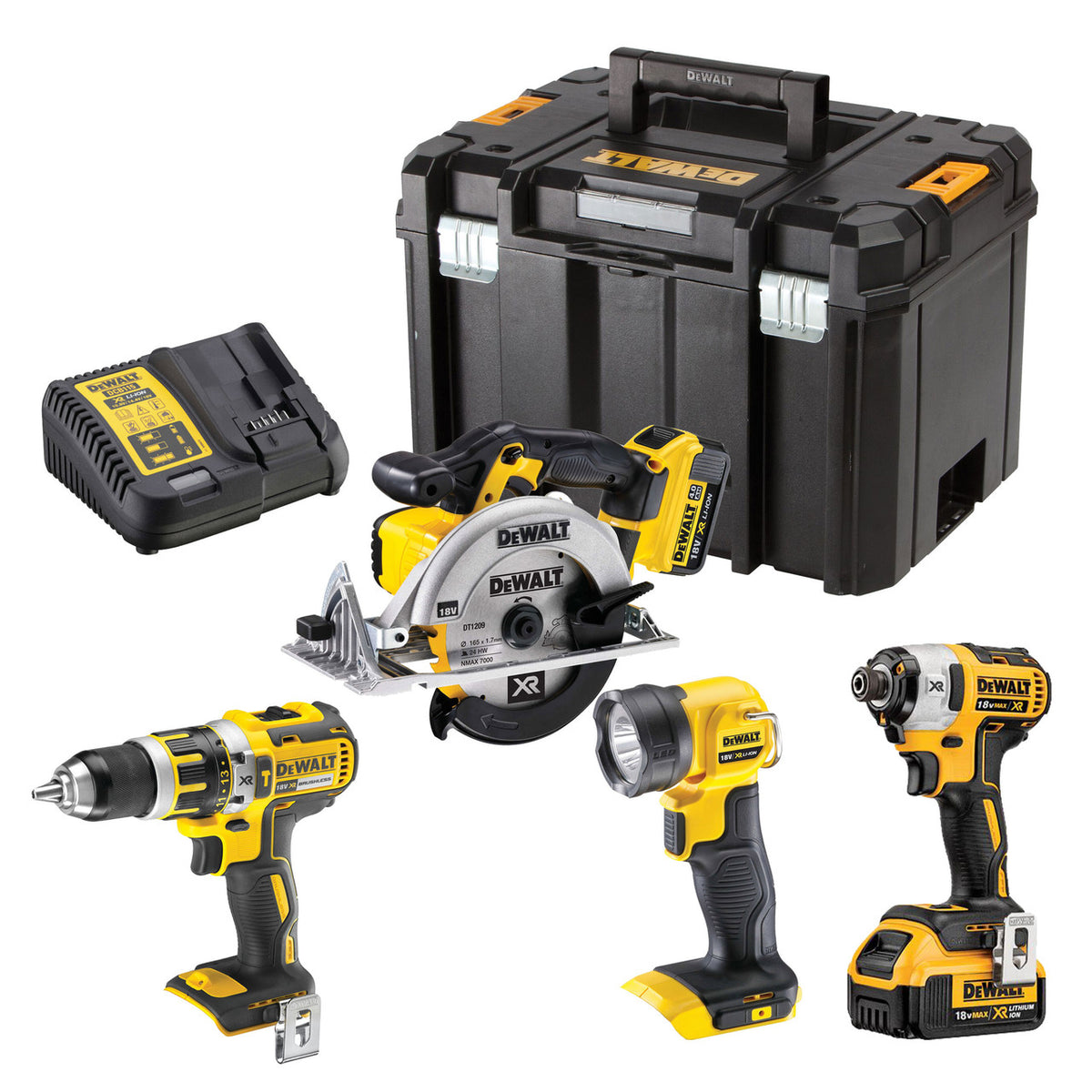 This exclusive 4 piece cordless kit from Dewalt contains the DCD795 combi drill, DCF887 impact driver, DCL040 torch, DCS391 165mm circular saw & DWST1-71195SP TStak Case