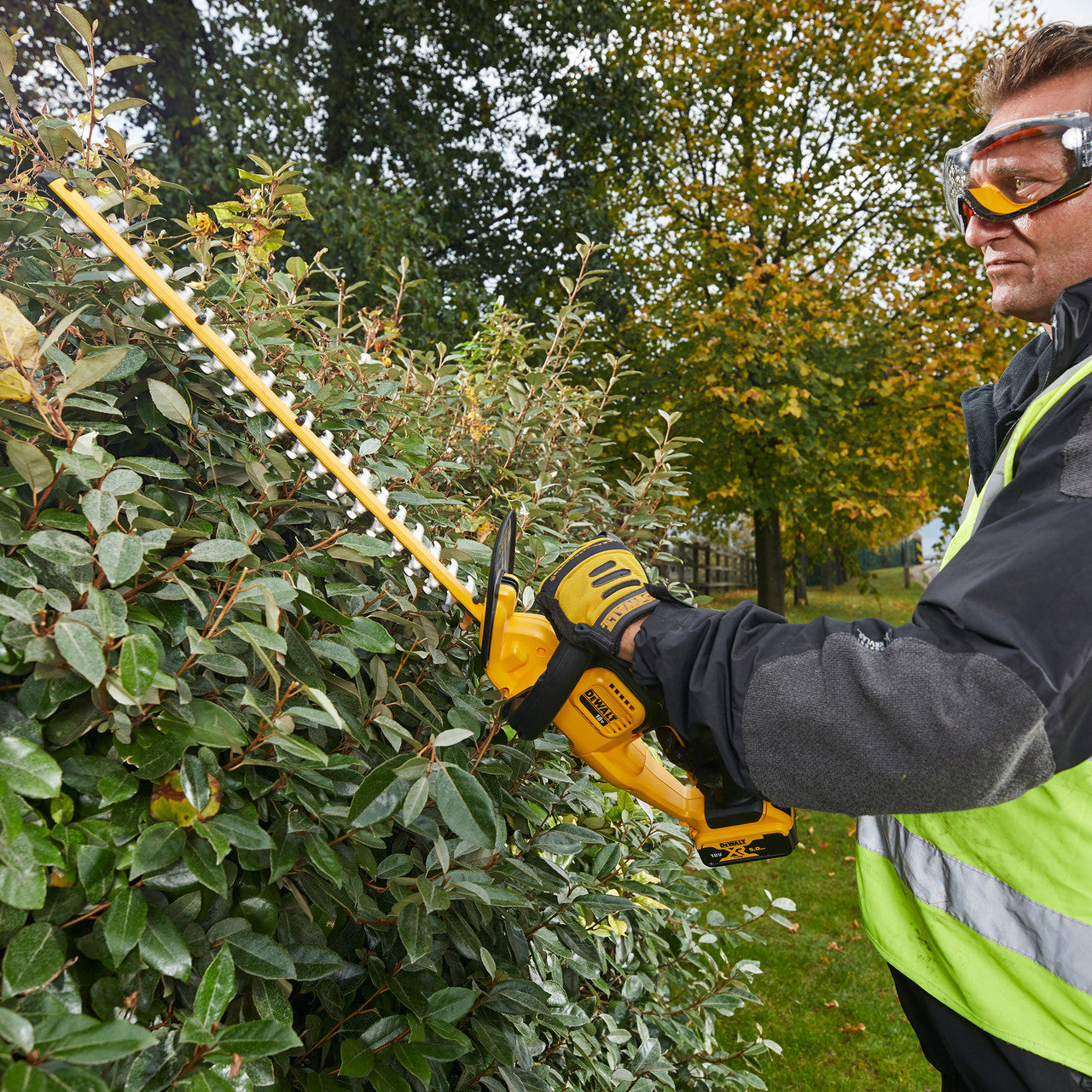 The Dewalt DCM563PB hedge trimmer allows professional performance with the massive bonus of using lithium battery power. This hedge trimmer has 55cm dual action laser cut blades with a 19mm cutting gap, manufactured from hardened steel. This product is sold without battery and charger.