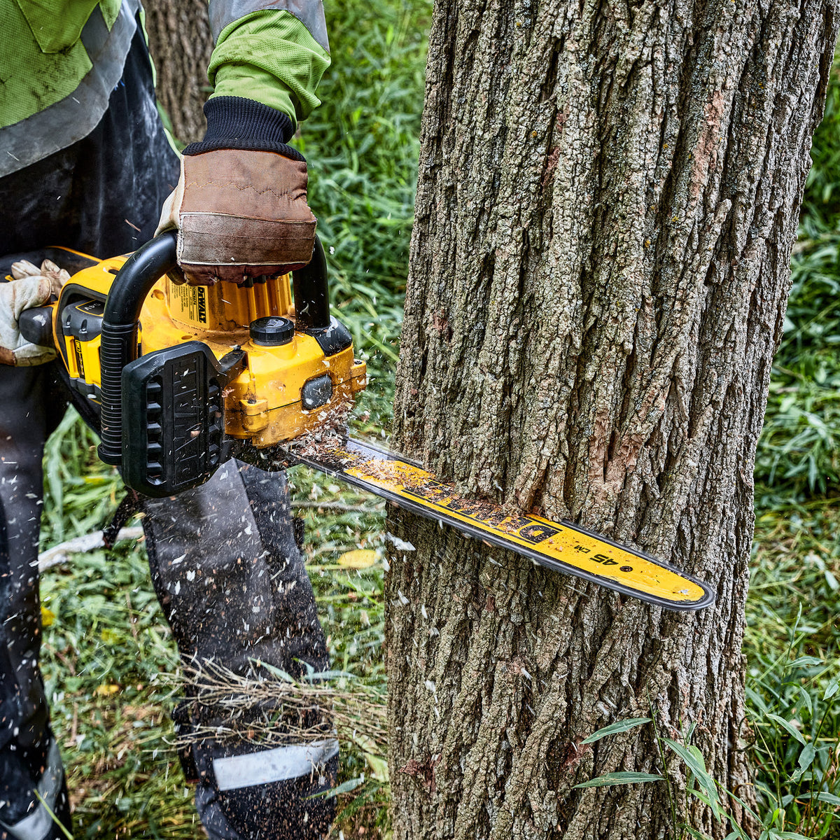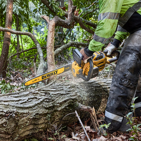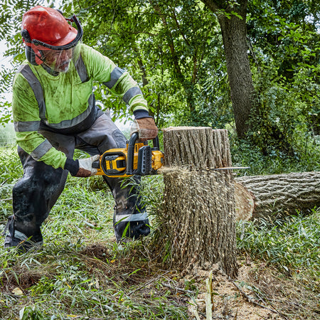 The Dewalt DCMCS574N is a body-only 54V FlexVolt Cordless Chainsaw that delivers performance on par with a 40cc petrol machine. Whether you're a professional lumberjack or a DIY enthusiast, this chainsaw will exceed your expectations and make your cutting tasks a breeze. Featuring a 45cm Oregon bar and chain, this chainsaw effortlessly cuts through logs, branches, and timber with remarkable speed and precision. The high-powered brushless motor delivers an impressive chain speed, ensuring smooth and efficient cuts every time. Safety is paramount when working with power tools, and DeWalt has prioritised it in the design of the DCMCS574N. The integrated chain brake provides instant stopping power, preventing kickback and ensuring your safety during operation and the tool-free chain tensioning system allows for quick and easy adjustments, minimising downtime and keeping you focused on the task at hand. Whether you're pruning trees, felling timber, or cutting firewood, the DCMCS574N handles it all with ease.