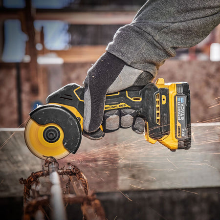 The Dewalt DCS438E2T is a cordless cut off saw measuring 76mm in diameter and coming with 2 x 1.8Ah Powerstack Batteries. It has a fully brushless motor which provides class-leading 550W of power for increased application performance. Its 22mm depth of cut is best in class and the variable blade direction feature allows for quick and simple changes and to divert sparks when working in confined areas. The tool-free adjustable dust guard removes harmful dust and debris from the atmosphere to help keep a clean and safe working environment.