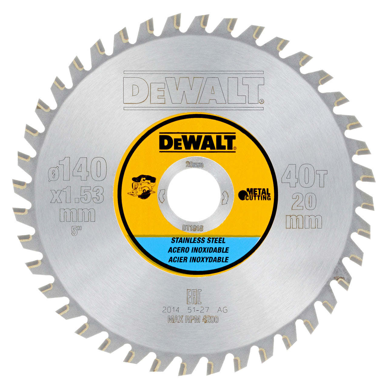 The Dewalt DT1918 is 140mm in diameter with a 20mm bore and 40 teeth. The blade is 1.13mm thick giving a kerf thickness of 1.53mm. Designed to power through stainless steel with ease, Dewalt stainless steel Metal Cutting saw blades are crafted from carbide for long life and less chipping. Each blade is laser etched and color coded by material.