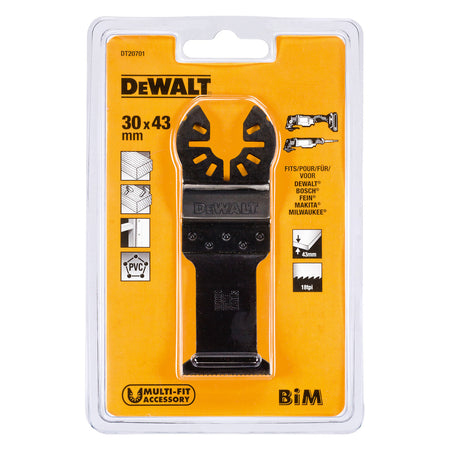 The Dewalt DT20701 fits most common oscillating multi-tools including Dewalt, Bosch, Fein, Makita and Milwaukee. The Bi-Metal Multi-Tool Blade is designed for cuts in wood, wood with nails, PVC, and drywall. It has a cutting depth of 43mm and a blade width of 30mm with 20 teeth per inch.