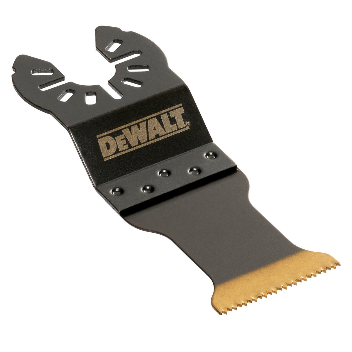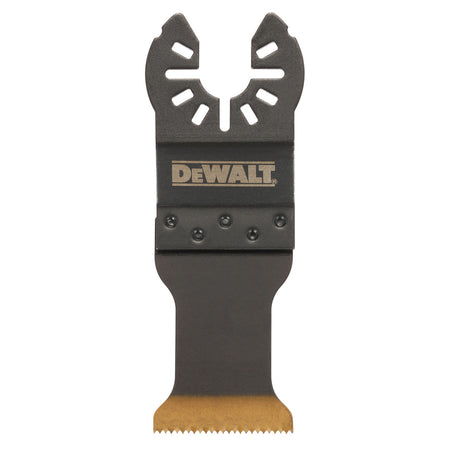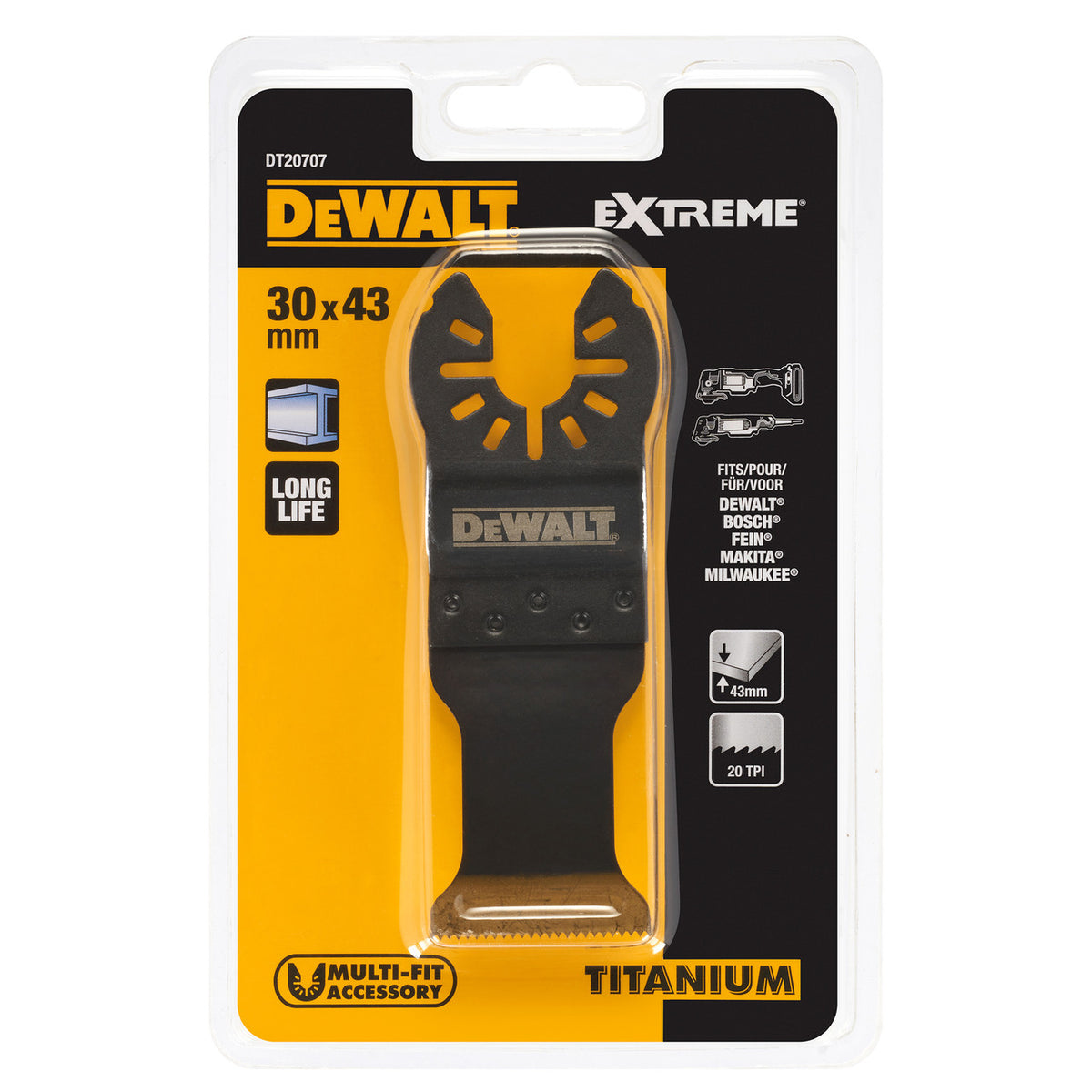 The Dewalt DT20707 fits most common oscillating multi-tools including Dewalt, Bosch, Fein, Makita and Milwaukee. The Titanium Multi-Tool Blade is designed for cuts in metal, wood, wood with nails, PVC, and drywall. It has a cutting depth of 43mm and a blade width of 30mm with 20 teeth per inch.