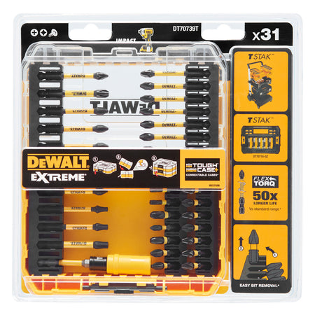 The Dewalt DT70739T is a Screwdriver Bit Set designed for use with Impact Drivers. The 31 Piece FLEXTORQ Set is made up with a mixture of 25mm and 57mm long Bits and a Magnetic Bit Holder with Torsion Zone. FLEXTORQ Bits are designed with a torque zone to absorb the highlights in the torque, allowing optimal bit flexibility and a longer life in demanding applications. They are stored in a Connectable Tough Case compatible with the TSTAK System via the Caddy and Large Tough Case.