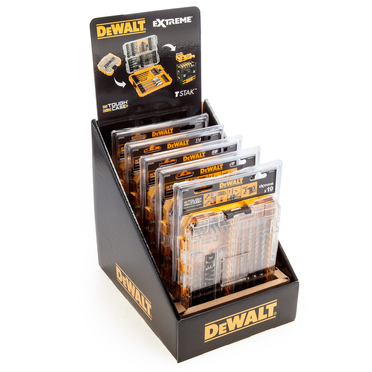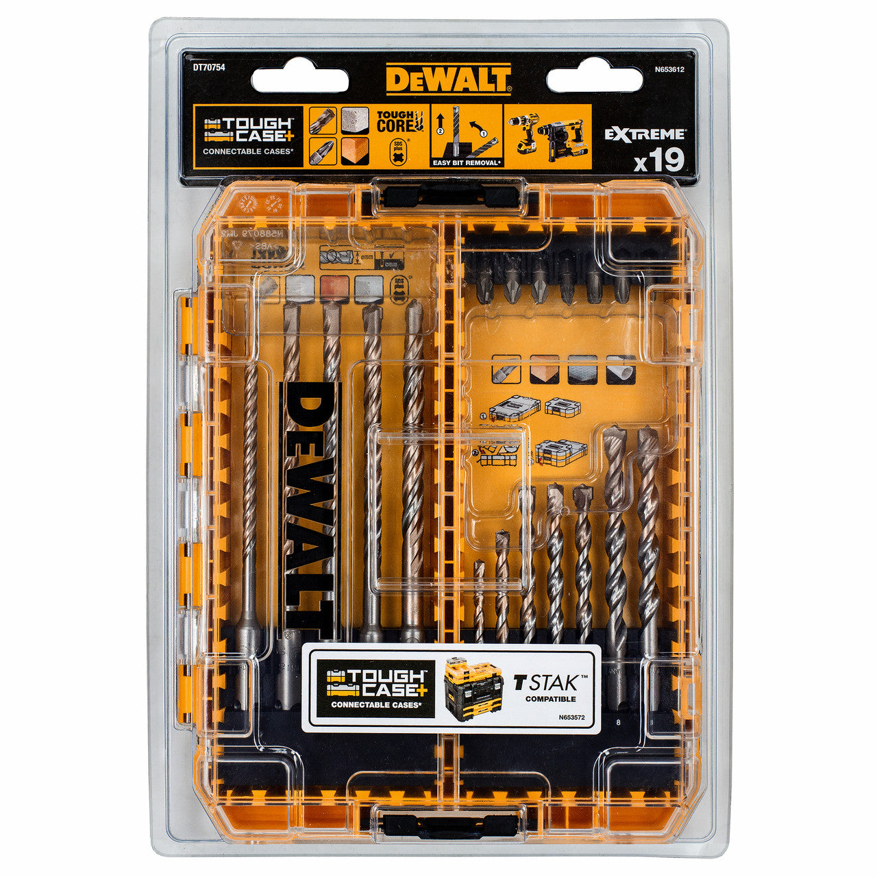 The Dewalt DT70754 is a 19 Piece Masonry Drill and Driver Bit Set that comes in a modular, stackable medium tough case. Designed for secure storage of accessories. Clear lid for easy bit identification. Easy bit removal and replacement. Use the locking system to connect the cases together, and securely stack with small, medium, and large Toughcases.