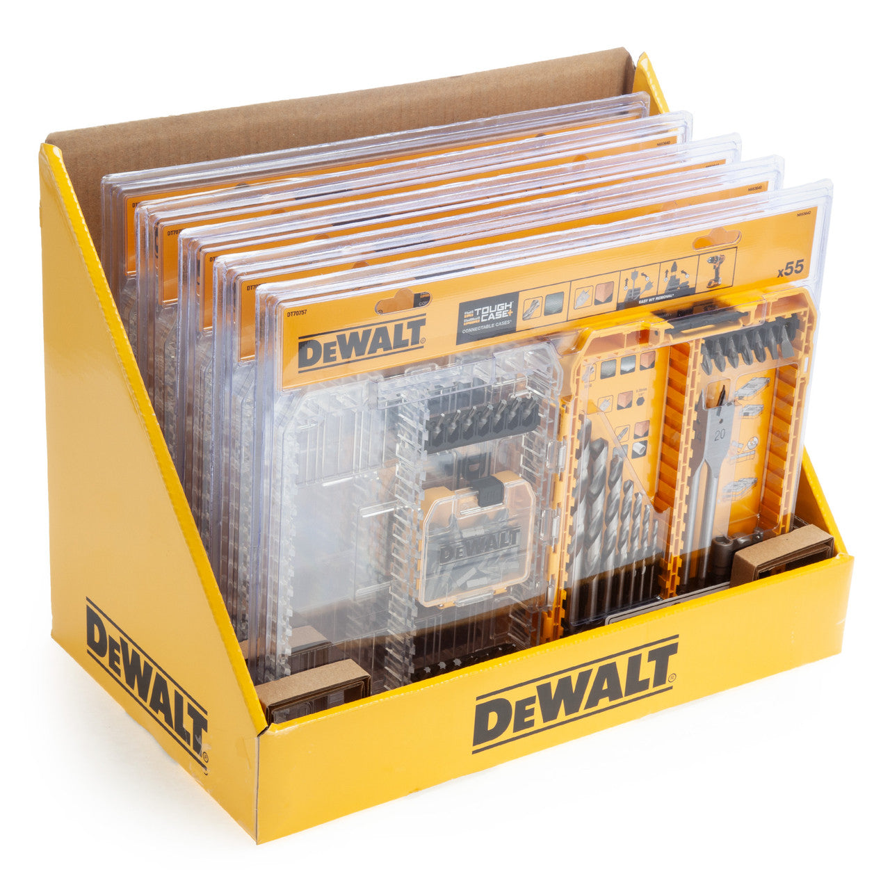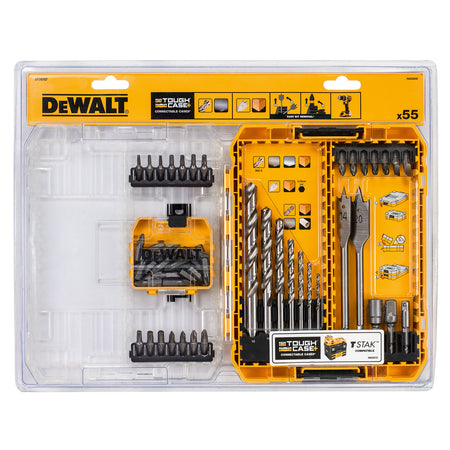 The Dewalt DT70757 Metal & Wood Drill Drive Set has 55 Pieces consisting of Drill Bits for Wood and Metal, Screwdriver Bits, 1 x Nut Driver and 2 x Adapters in a modular, stackable medium Tough Case. Designed for secure storage of accessories with a clear lid for easy bit identification. Use the locking system to connect the cases together, and securely stack with small, medium, and large Toughcases.