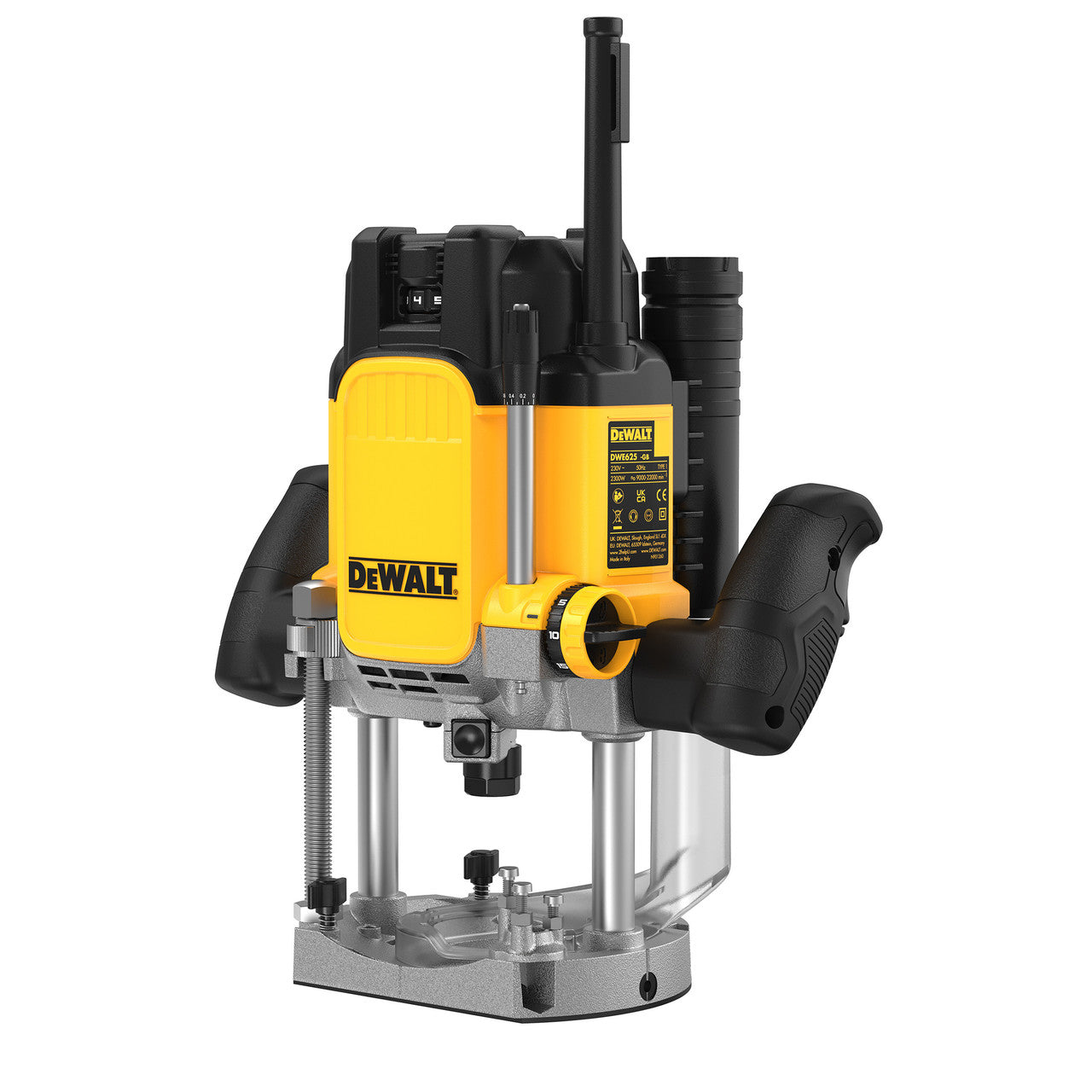 The DWE625KT 240V Router delivers 2300 watts of power to tackle the toughest materials and applications such as cutting worktops and morticing and is ideal for onsite and workshop use. The one-touch plunge lock, 80mm plunge capacity and variable speed make this router accurate, easy to use and versatile. The twin LED light illuminates the workpiece to remove shadows and the improved Airlock-compatible dust extraction port gives a cleaner safer work environment. The DWE625 shares the same base as the DW625 so all of your existing bushes and attachments are compatible. It comes with a parallel fence, 1/2 inch collet, dust extraction attachments and a TSTAK Box.