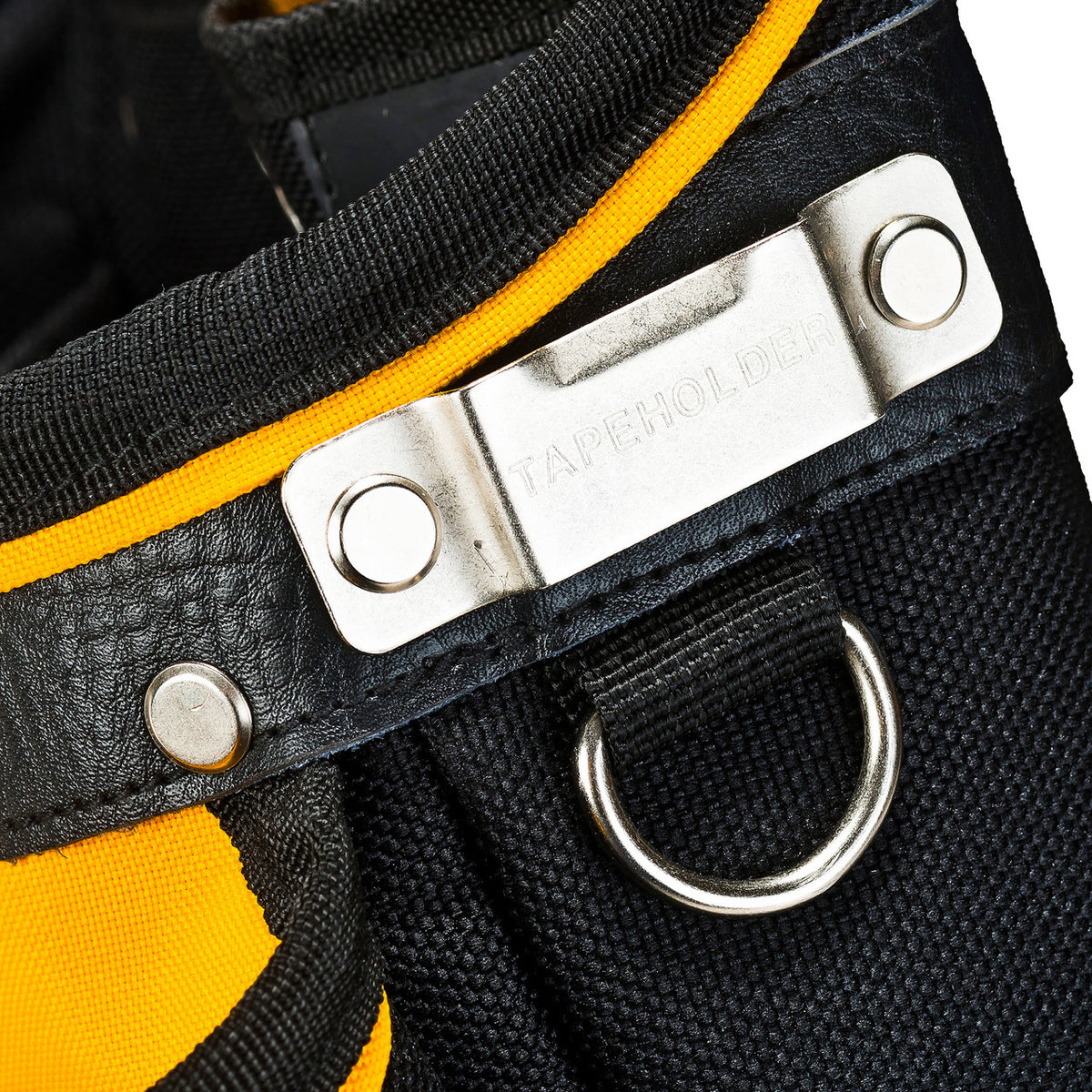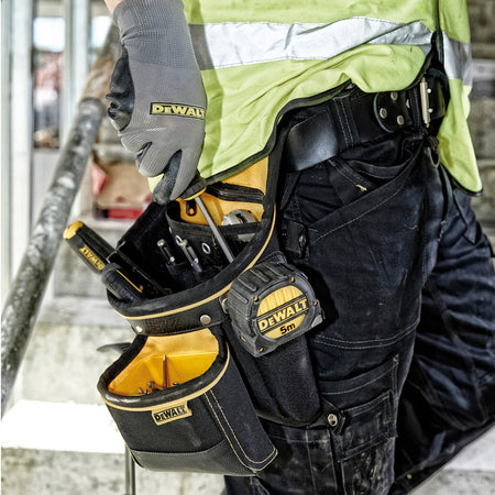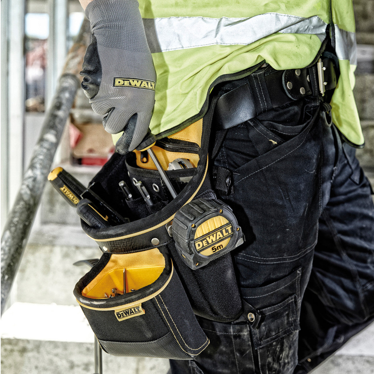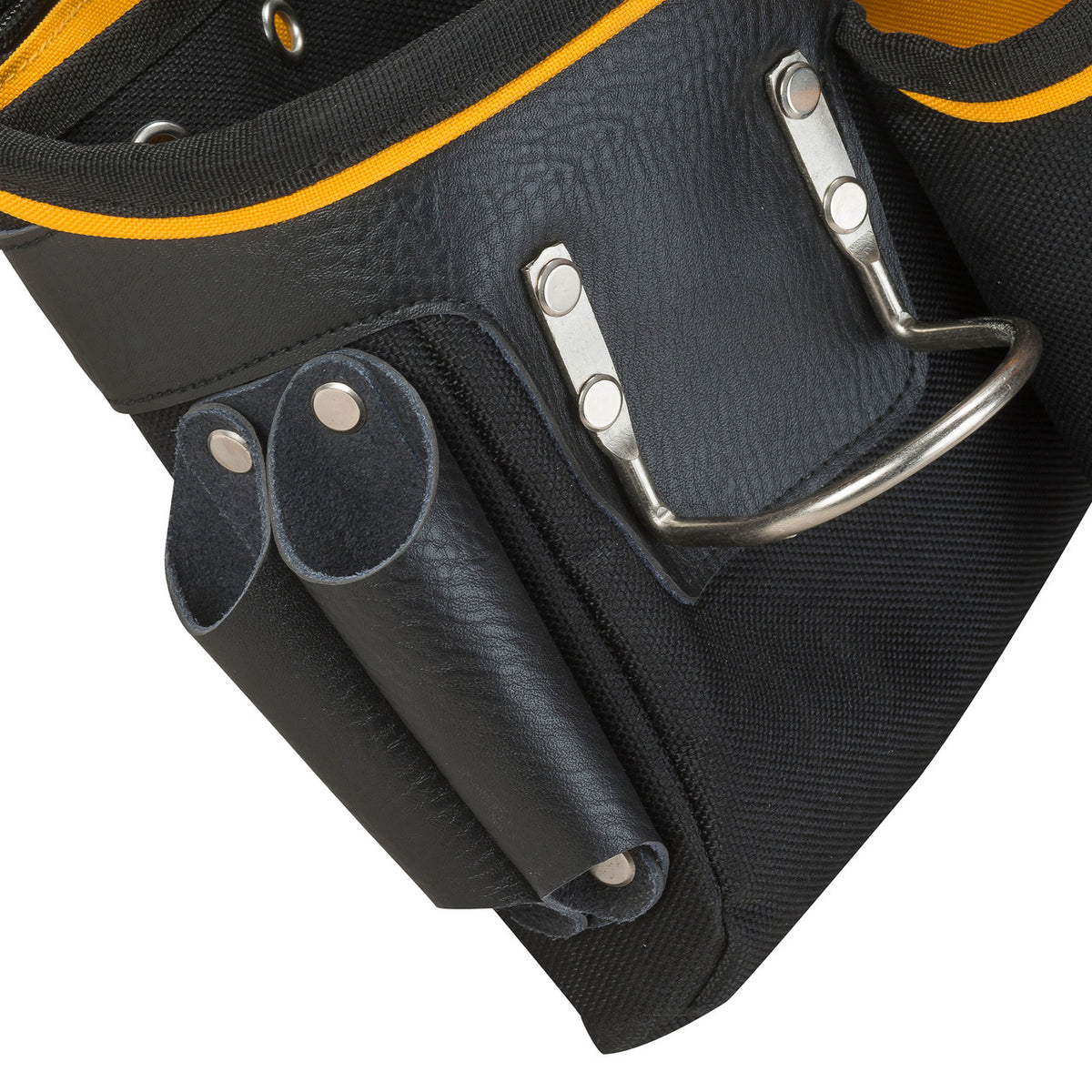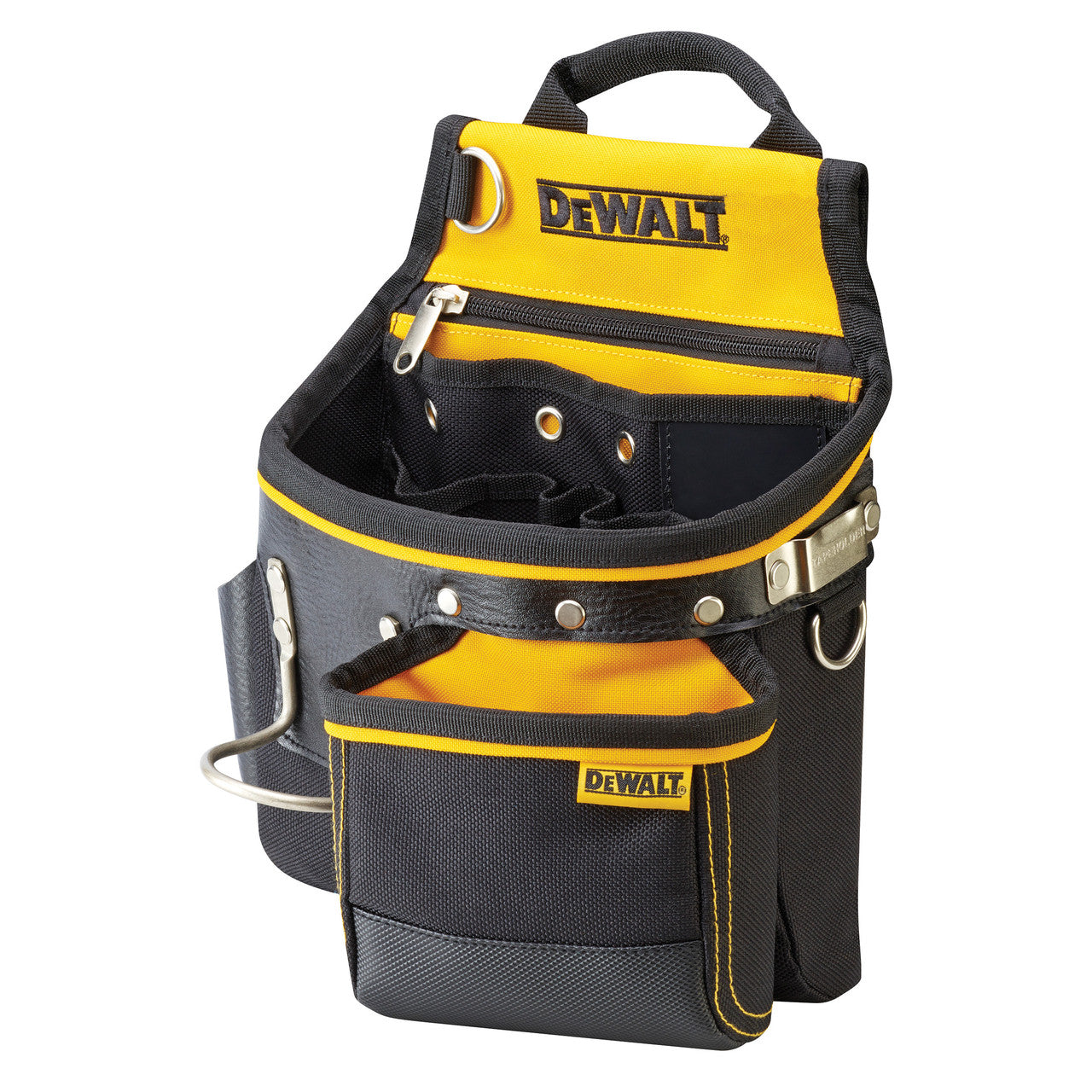 The DewaltDWST1-75652 Hammer and Nail Pouch has multiple size pockets & loops - maximizing organization for tools and small parts. Also fitted with an extreme duty metal hammer loop giving easy access to hammer at worksite. With metal rivets for extra reinforcement and extra leather on high friction points. The DEWALT organizer cup can fit into the single nail pocket. The pouch is made from 1200 denier- strong & durable polyester fabric with a rugged PVC bottom cover - protects from wear and tear. The large zippered pocket is suitable for all essentials like a wallet, keys and phone. A specially designed pocket offers maximum protection for a jab saw. Has an integrated metal clip tape holder too. Does not include a belt.