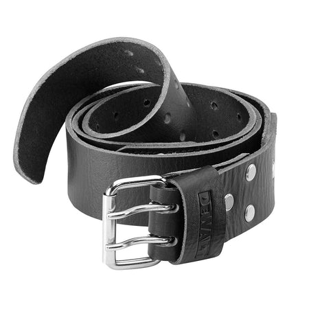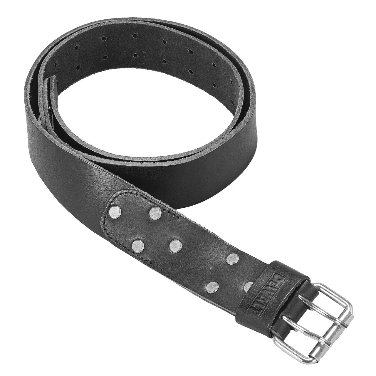 The Dewalt DWST1-75661 is a heavy-duty, thick Leather Belt with a double tongue roller buckle and rivets for added strength.