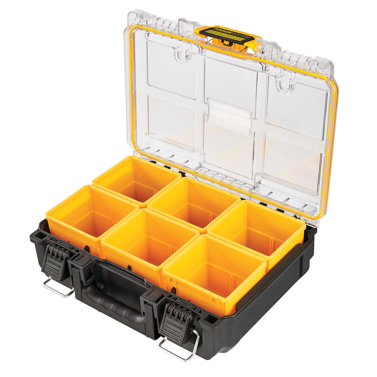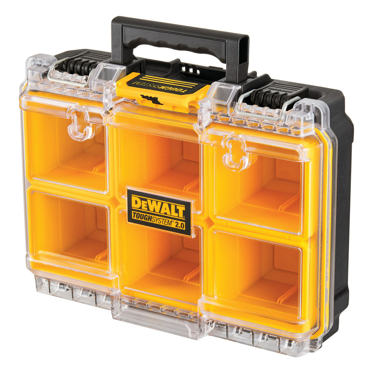 Two DWST83392-1 organisers can be stacked on top of a full sized Toughsystem case allowing you to carry more items in one go which saves you time. The intergrated carry handle and removable inserts are designed for easy access and ease of use. The organiser features a heavy duty build quality allowing for long term reliability when used on sites or industrial environments. Supplied with 6 x removable inserts.